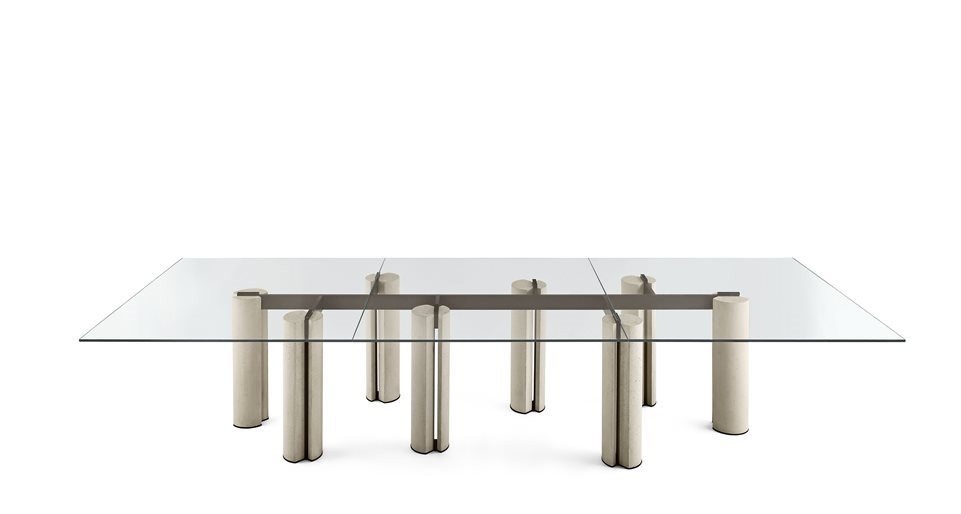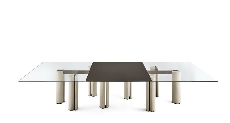 Tavolo con piano in cristallo 12mm temperato, disponibile in extralight, “Grigio Italia” o verniciato nella finitura esclusiva bronzo antico o piombo. Basi in cemento alleggerito color avorio o carbone. Parti metalliche in metallo laccato color fango.