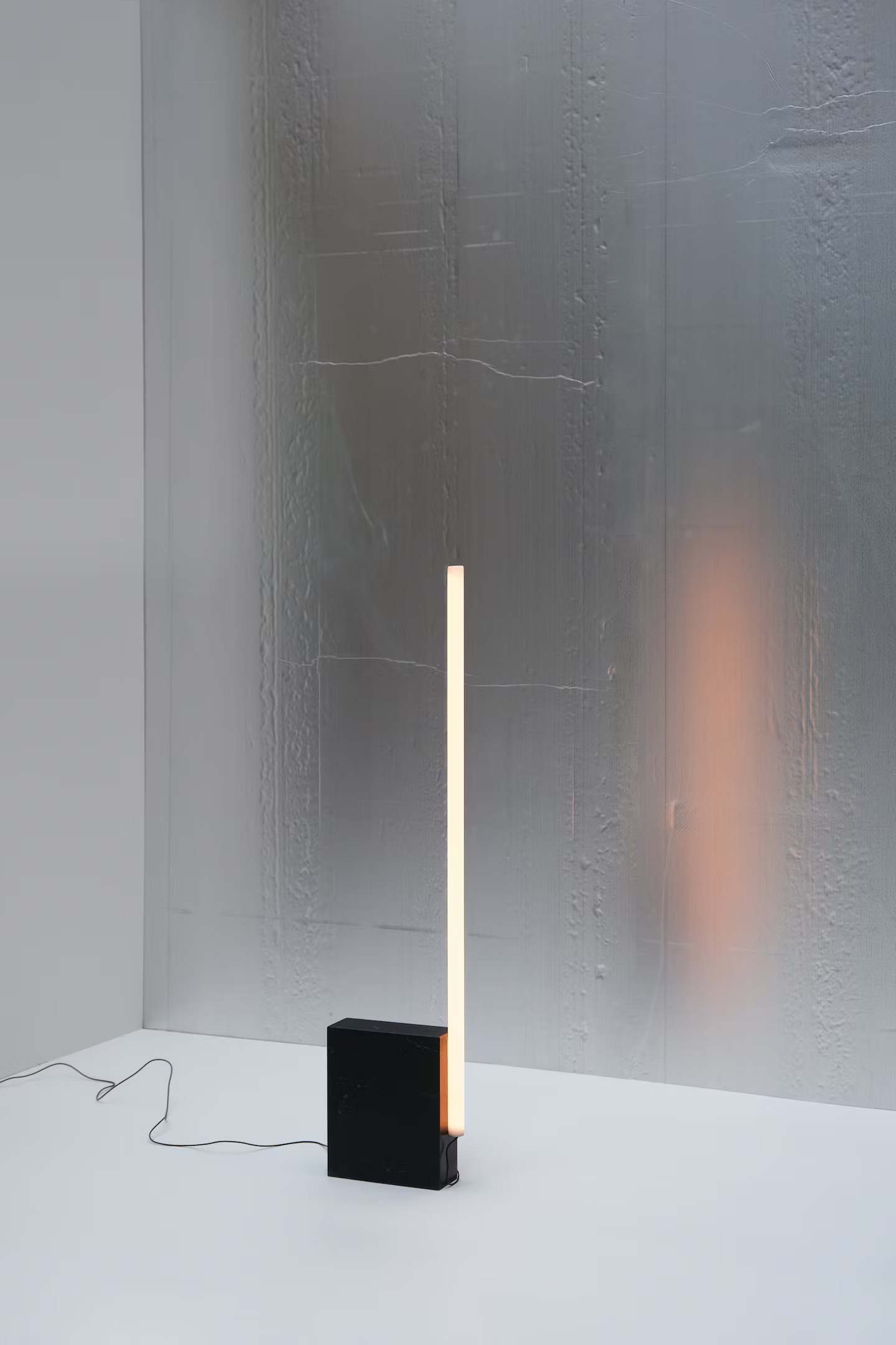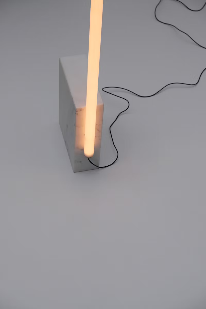 This family of floor lamps proposes an interchangeable lighting solution attached to a marble block. The exercise is an attempt to provide minimal support for the linear lighting elements through the simple gesture of touching the marble base with an invisible magnetic connection. The result is a distilled composition of basic elements.