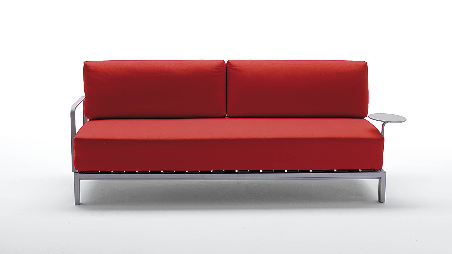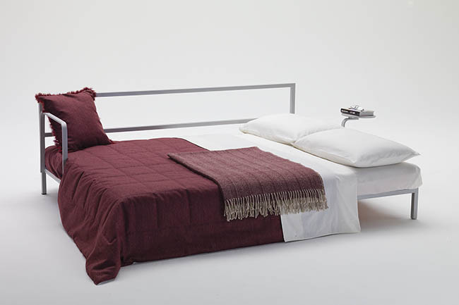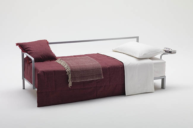 Willy Side is distinctive yet elegant, a style that is enhanced by the hammered silver metal frame. The easy-to-use front-opening mechanism and the convenient foldaway mattress avoid sitting on the bedding. The 11 cm. high foam mattress has a removable lining and is covered in a fabric of customer’s choice, while the bed base has a 100% cotton ecru quilt cover. Willy Side can be also used as a single bed without opening the mechanism, with a 22 cm. high mattress. Willy Side is available to order with a removable cover for the bed-head, as well as a duvet, pillows, metal armrests, rotating table and a wooden tray.