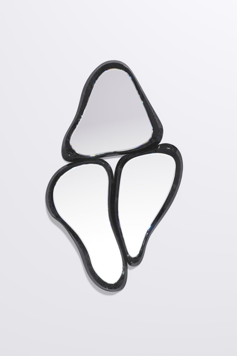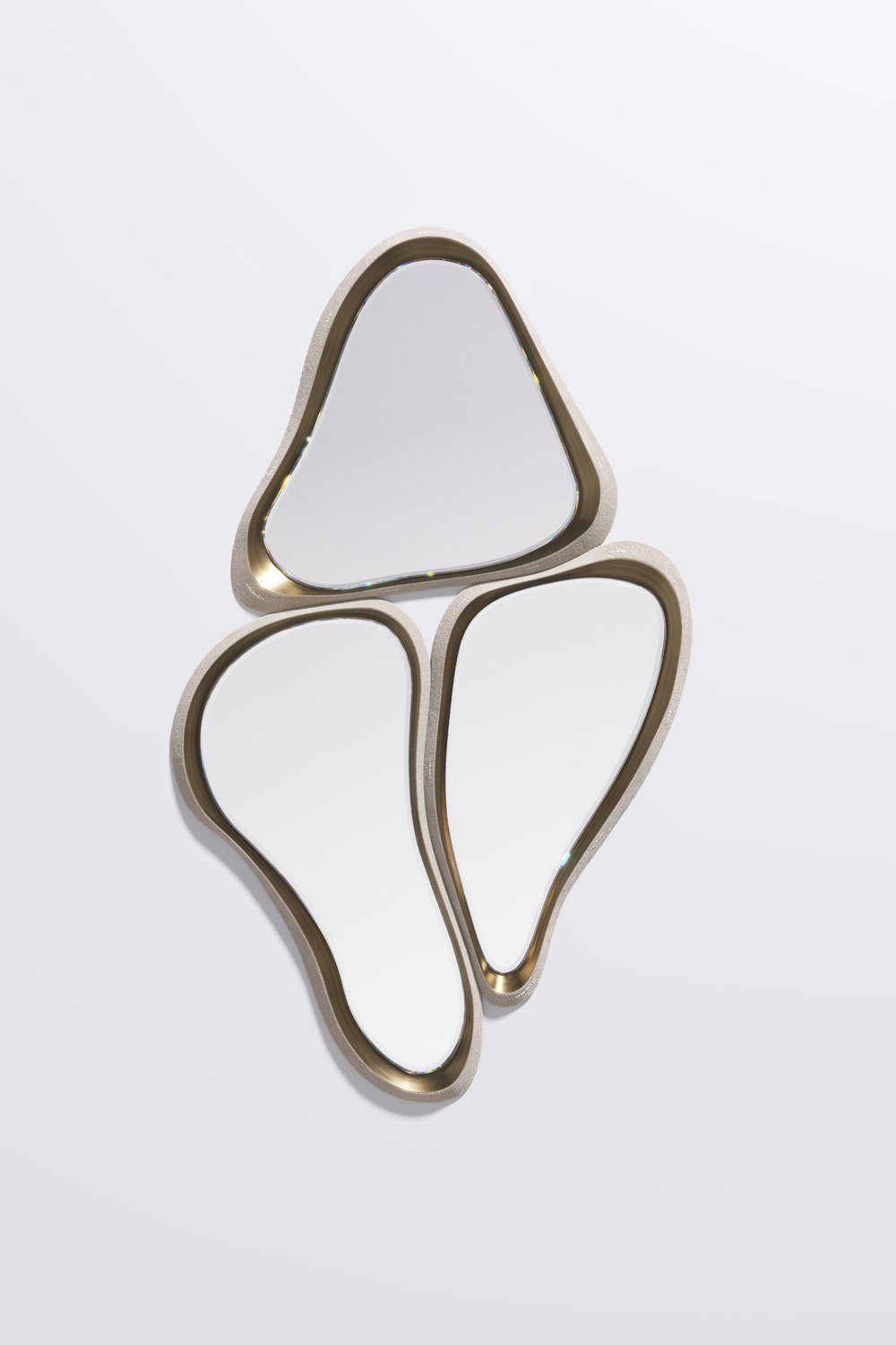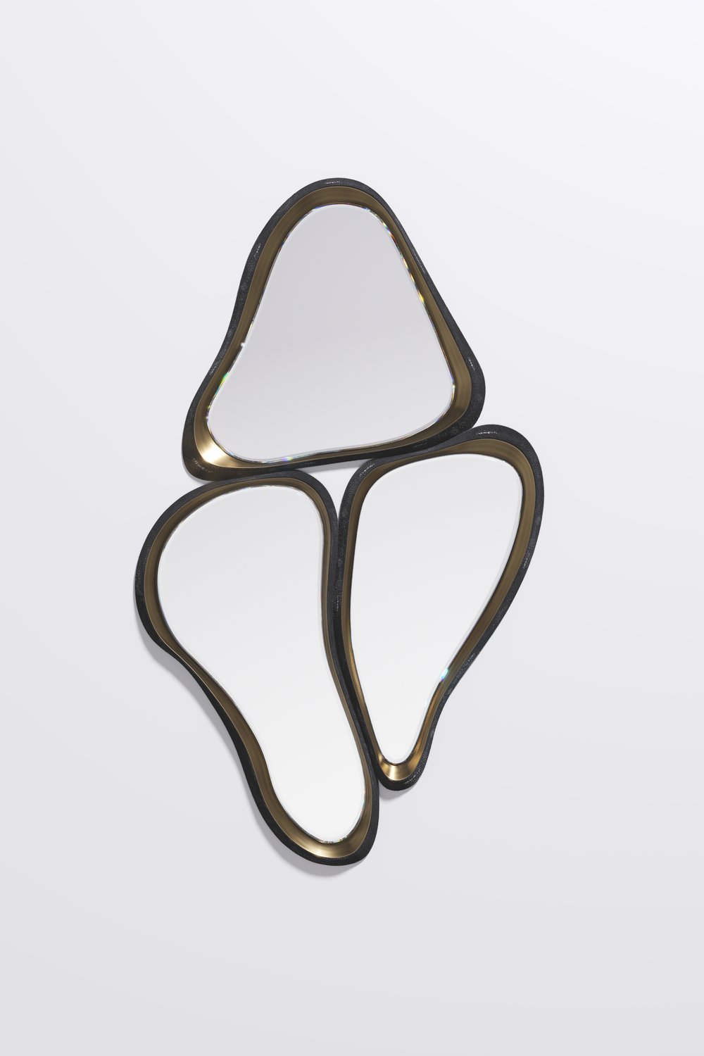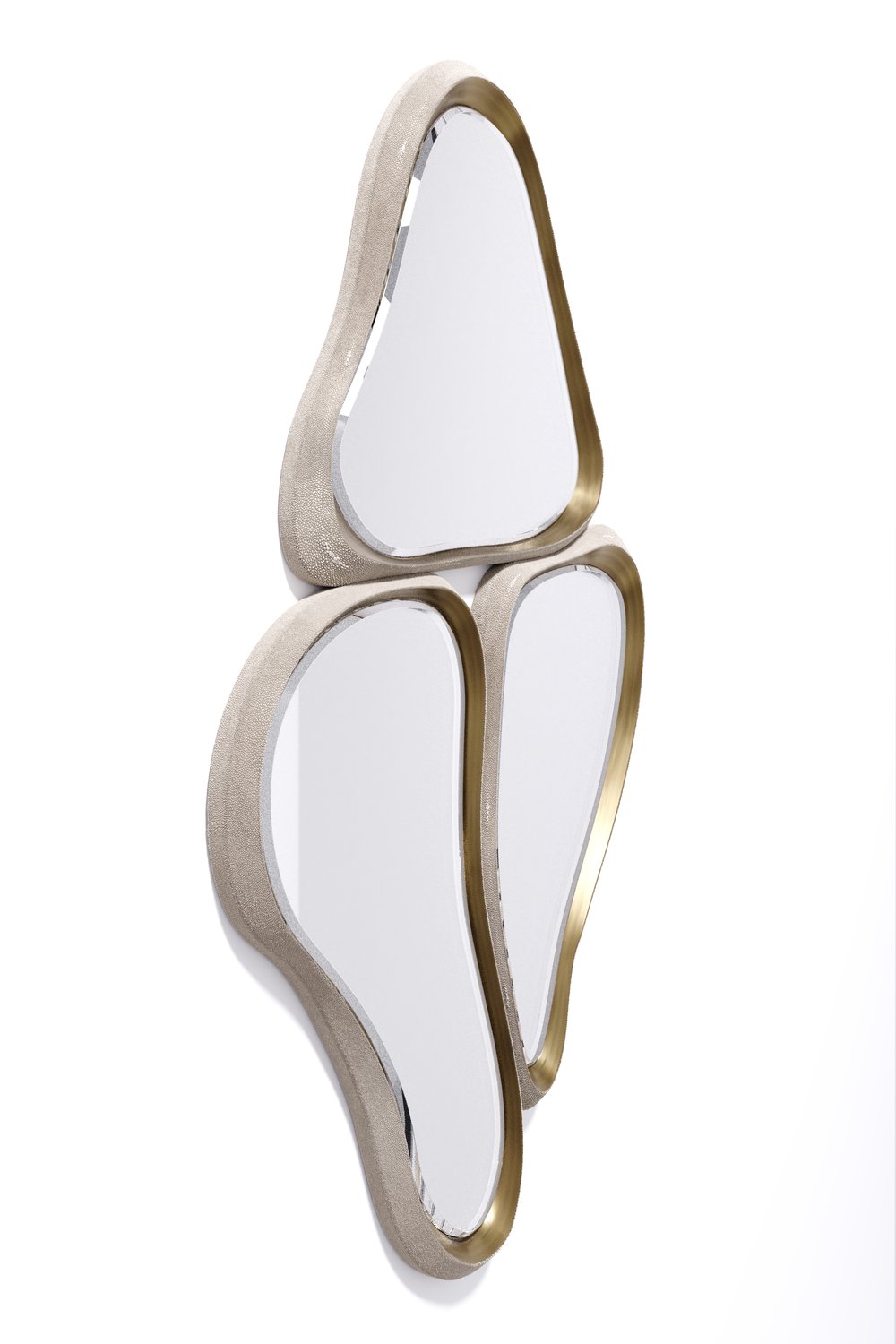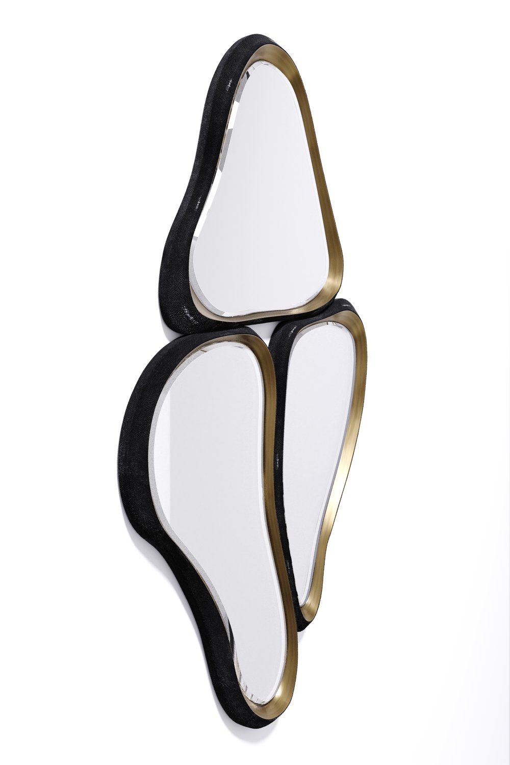 The Mask mirror is a statement and versatile piece. The 3 piece amorphous mirror melt into one another to create a fluid and dramatic expression. The frame is inlaid in either shagreen or pen shell with bronze-patina brass.This piece is designed by Kifu Augousti, the daughter of Ria and Yiouri Augousti.
