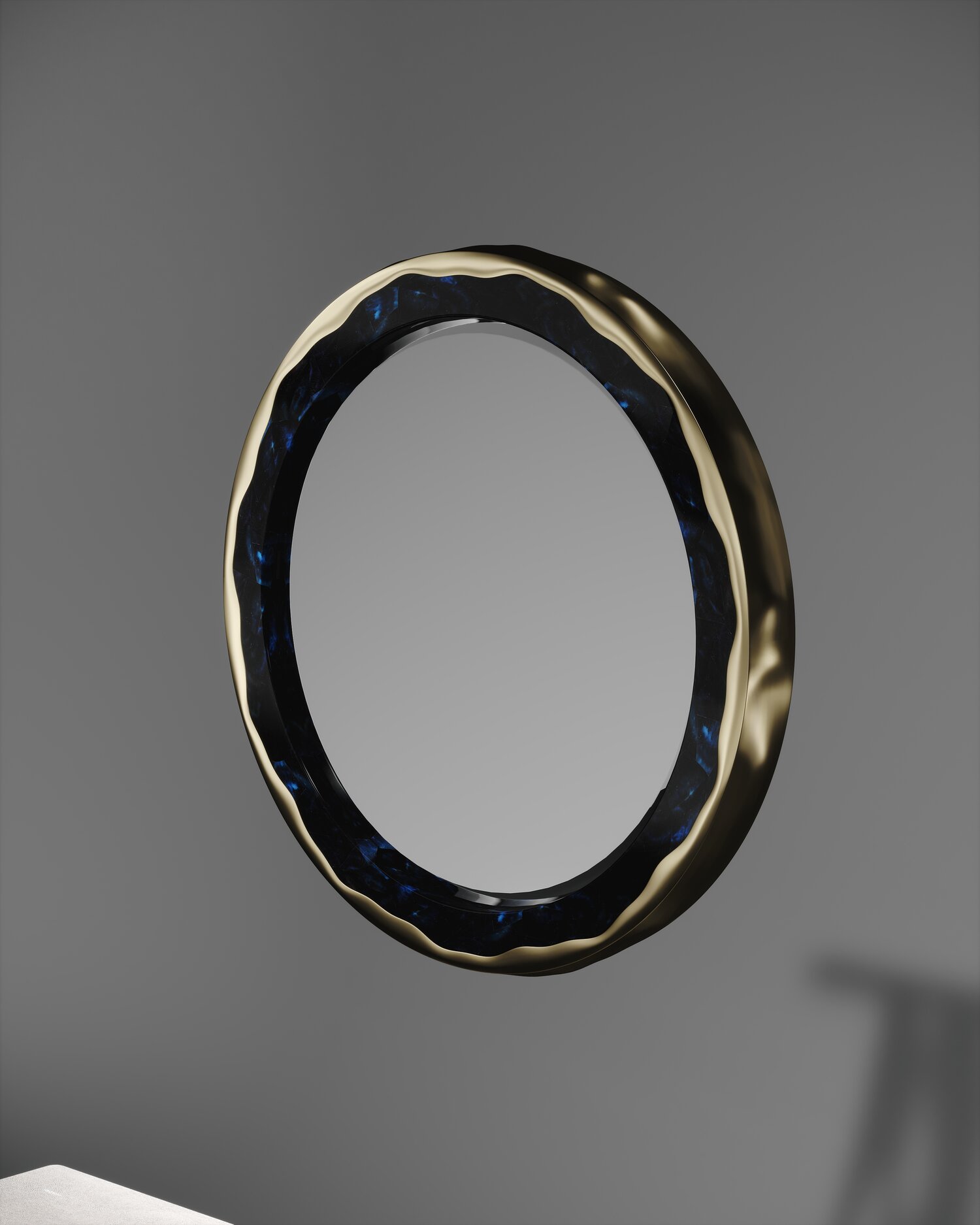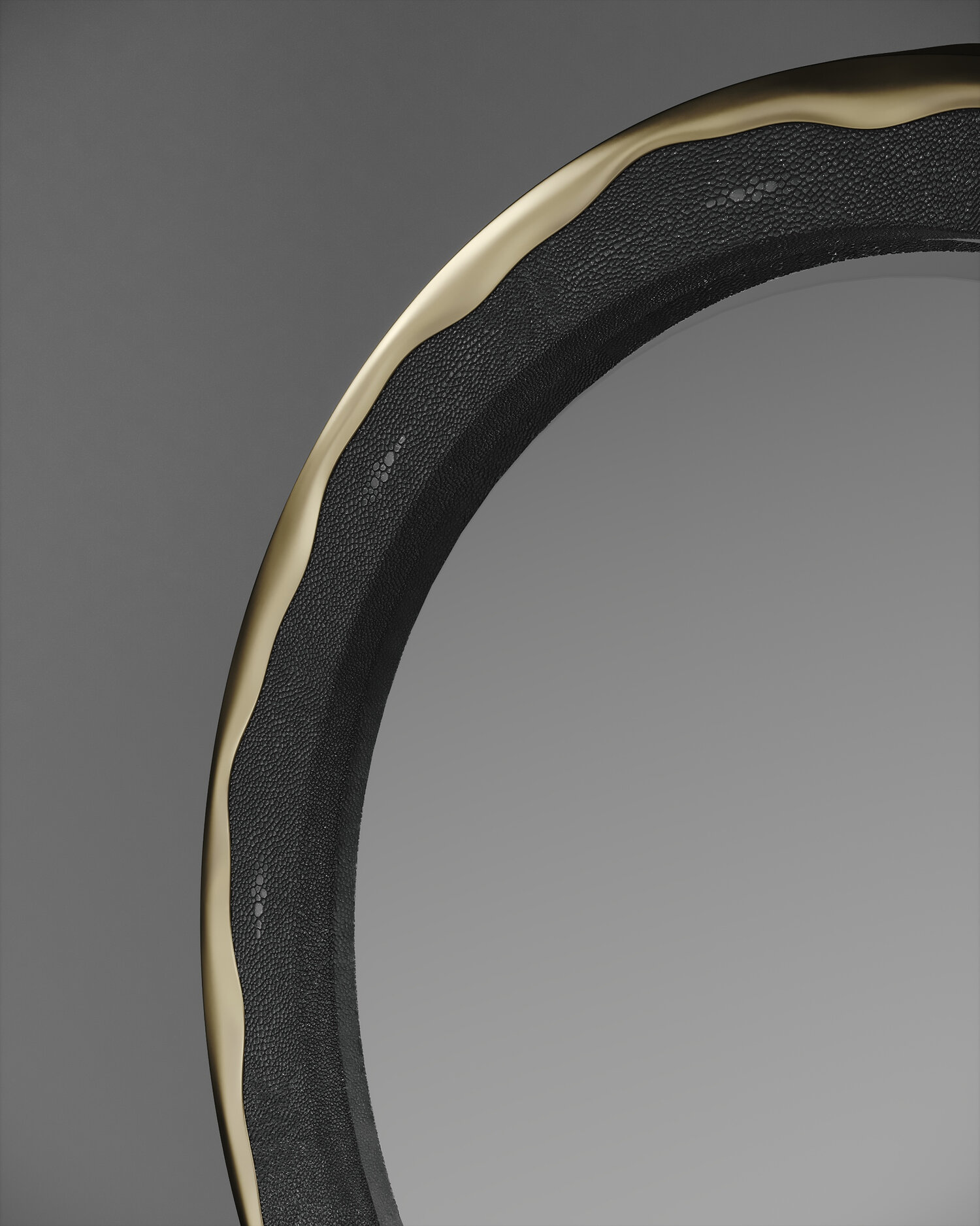 The Melting Mirror by R&Y Augousti in cream shagreen and bronze-patina brass, is an iconic piece of theirs with their signature "melting" metal detail. Available in other finishes and a large size, as well as a "cut out" version.