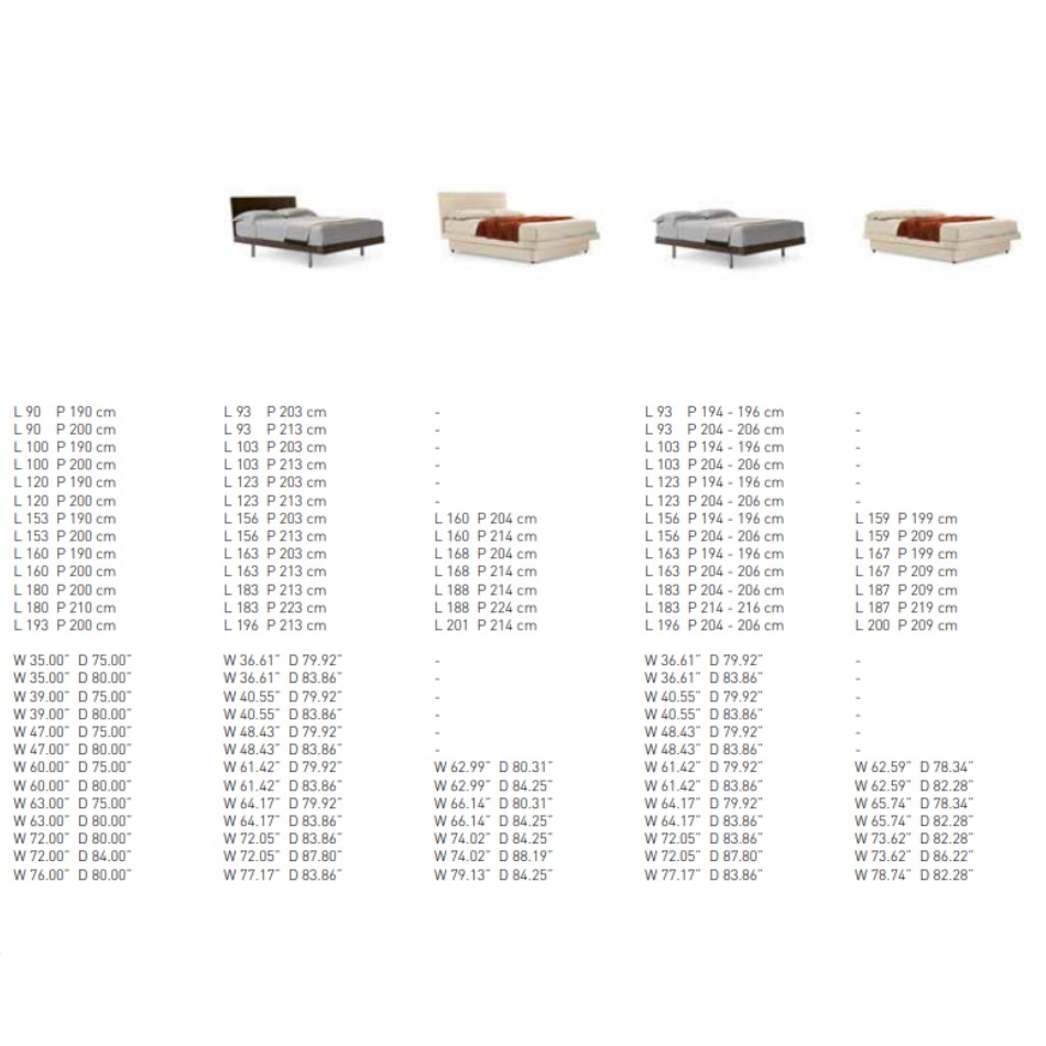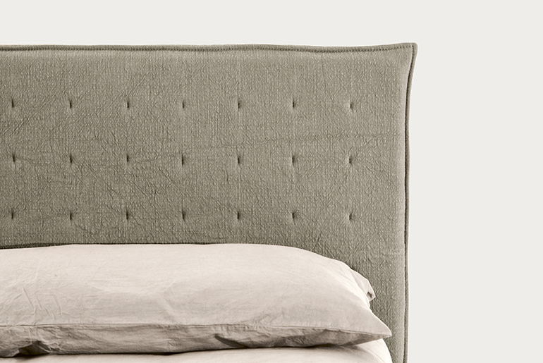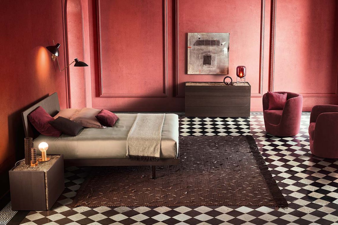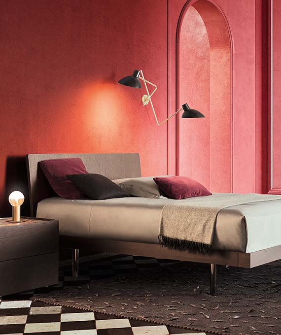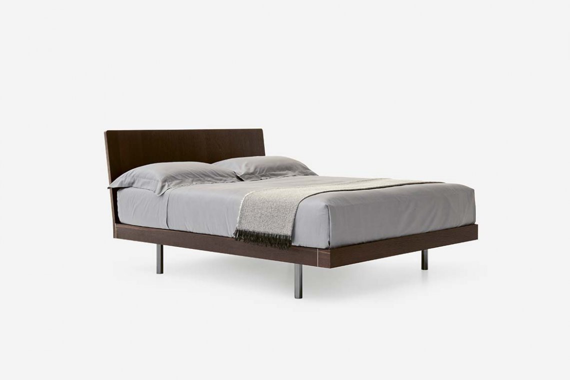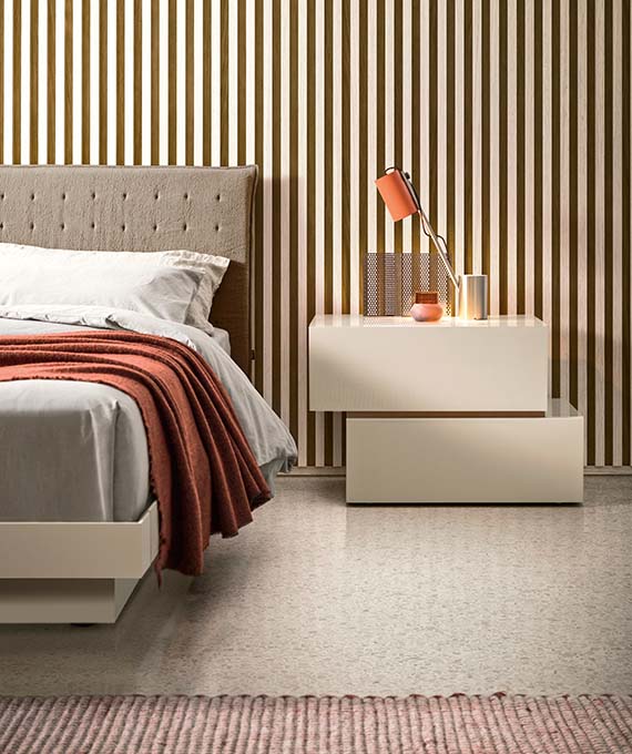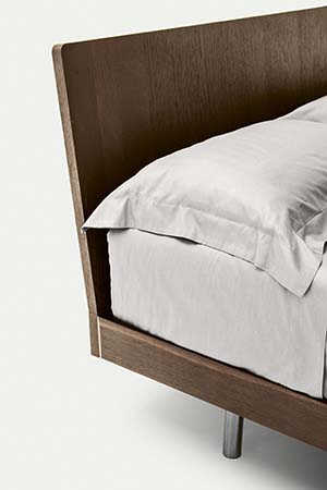 A versatile bed available in many versions. Individual tastes, used to customise the various elements, steal the show here. The frame consists of simple, clean-cut lines and is available in wood, matt or gloss lacquered or with a textured finish. There are two options for the base: a classic version with feet or a version with a storage compartment consisting of inwardly-slanting volumes that enhance practicality and give the bed a light and airy appeal. The headboard can be upholstered in fabric or leather.