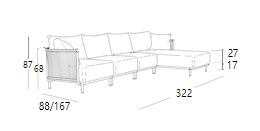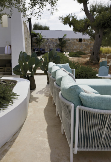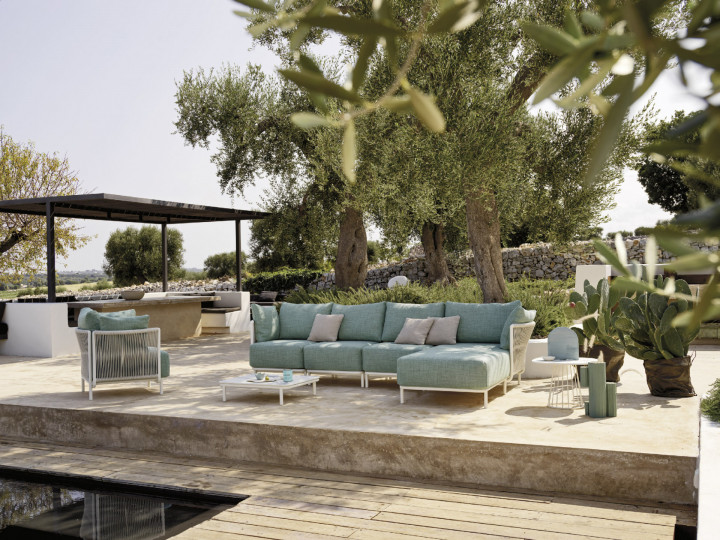 Divano in acciaio 304 verniciato a polveri, intrecciato con Flat Trendyrope. Un divano accogliente, dove la particolare geometria dello schienale si coniuga perfettamente al desiderio di comfort,  creando un angolo per vivere momenti di relax. Ottimo per arredare terrazzi e patio, dona forte personalità anche alle zone living interne. Ideale per arredamenti residenziali e contract.