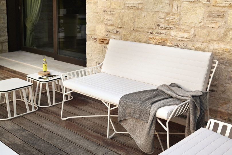 Divano in acciaio 304 verniciato a polveri, intrecciato con Flat Trendyrope. Un divano accogliente, dove la particolare geometria dello schienale si coniuga perfettamente al desiderio di comfort,  creando un angolo per vivere momenti di relax. Ottimo per arredare terrazzi e patio, dona forte personalità anche alle zone living interne. Ideale per arredamenti residenziali e contract.