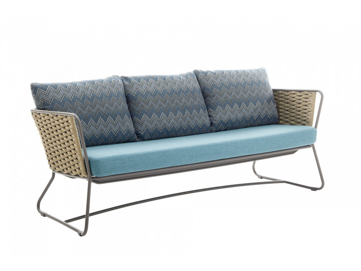 Divano in acciaio 304 verniciato a polveri, intrecciato con Flat Trendyrope. Un divano accogliente, dove la particolare geometria dello schienale si coniuga perfettamente al desiderio di comfort, creando un angolo per vivere momenti di relax. Ottimo per arredare terrazzi e patio, dona forte personalità anche alle zone living interne. Ideale per arredamenti residenziali e contract.