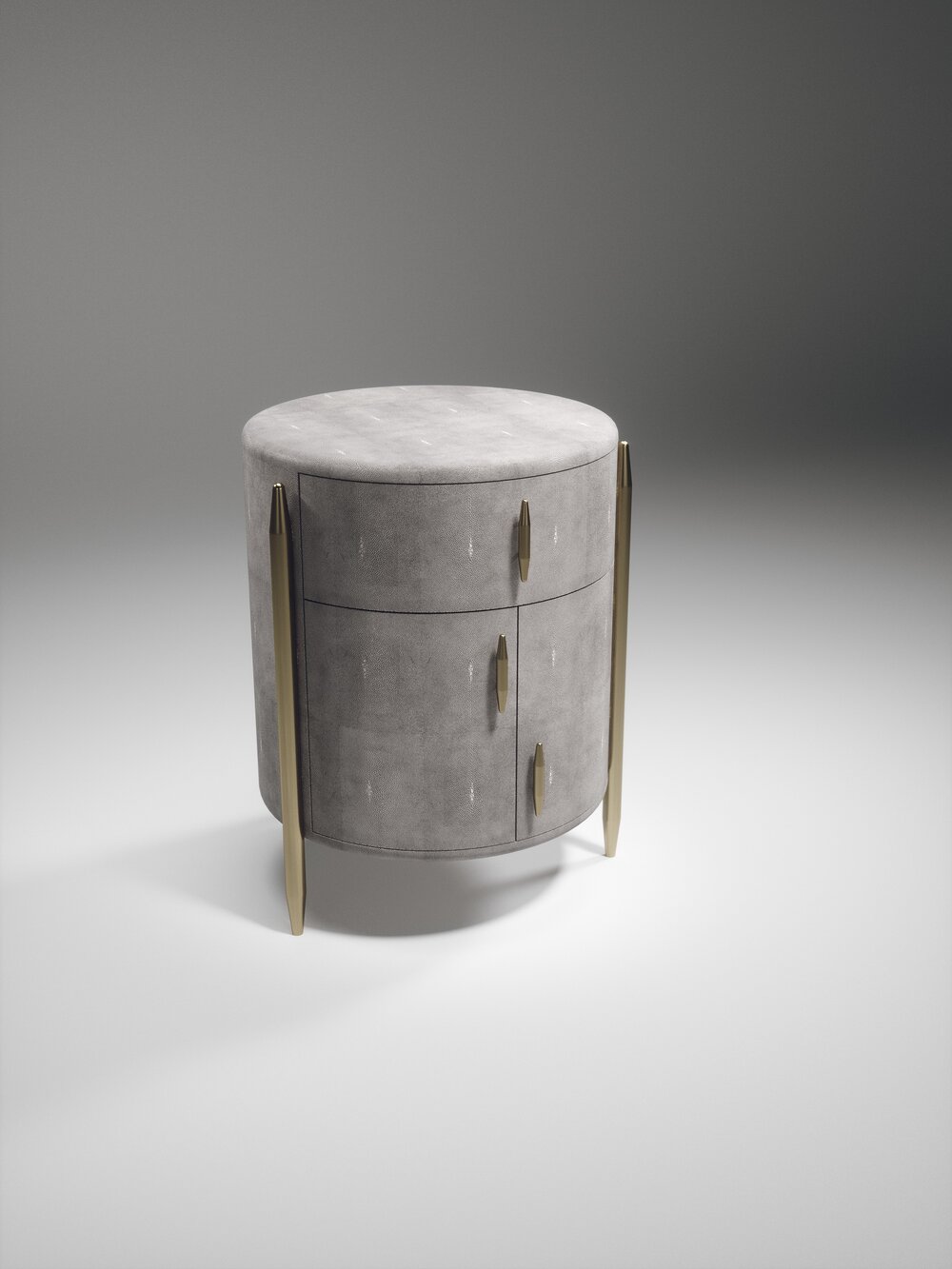 The Dandy Round Bedside Table by Kifu Paris is an elegant and a luxurious home accent, inlaid in cream shagreen with bronze-patina brass details. This piece includes 1 drawer total and a cabinet below; the interiors are inlaid in gemelina wood veneer. Available in other finishes and as a square version. This piece is designed by Kifu Augousti, the daughter of Ria and Yiouri Augousti.、