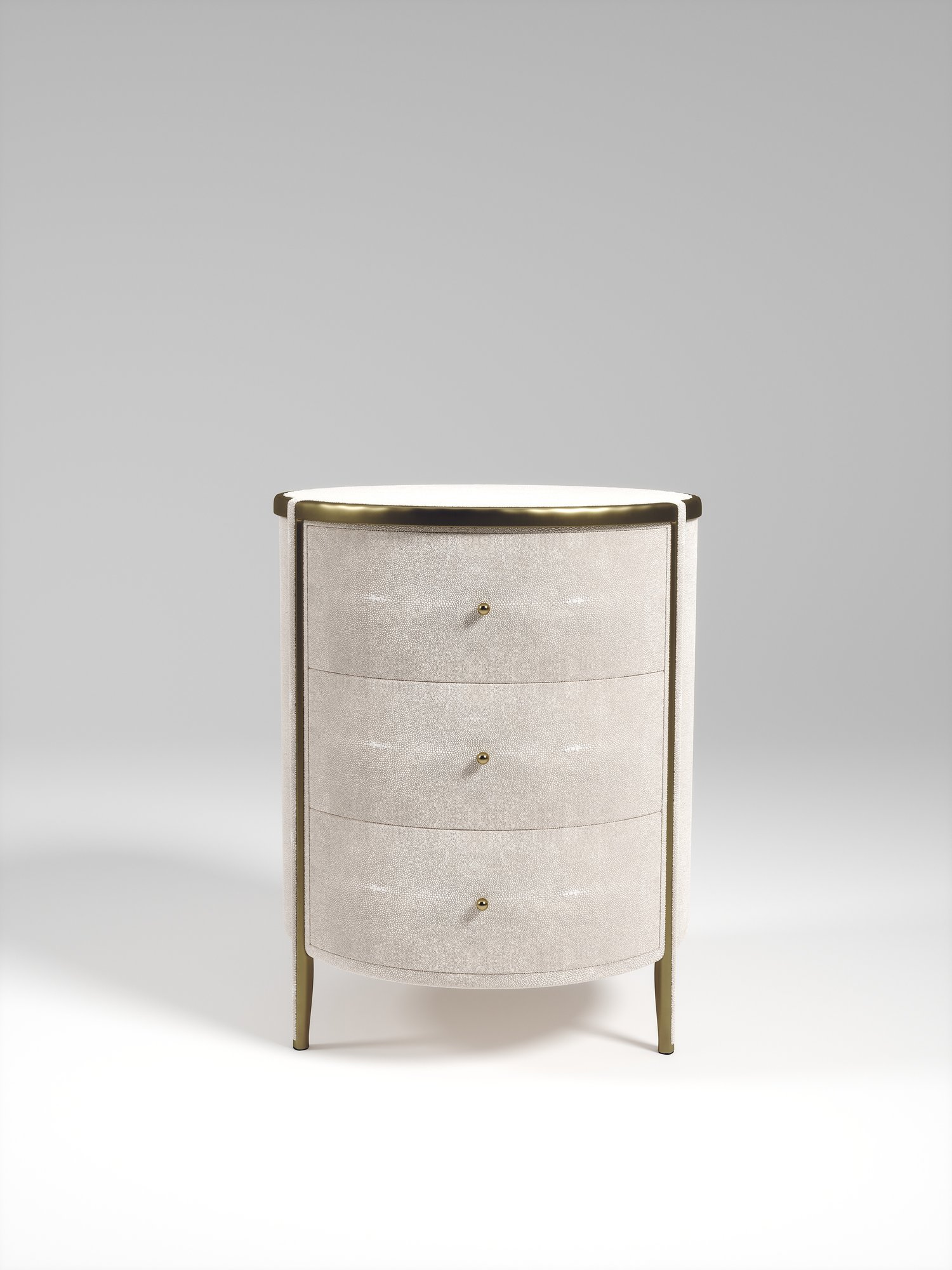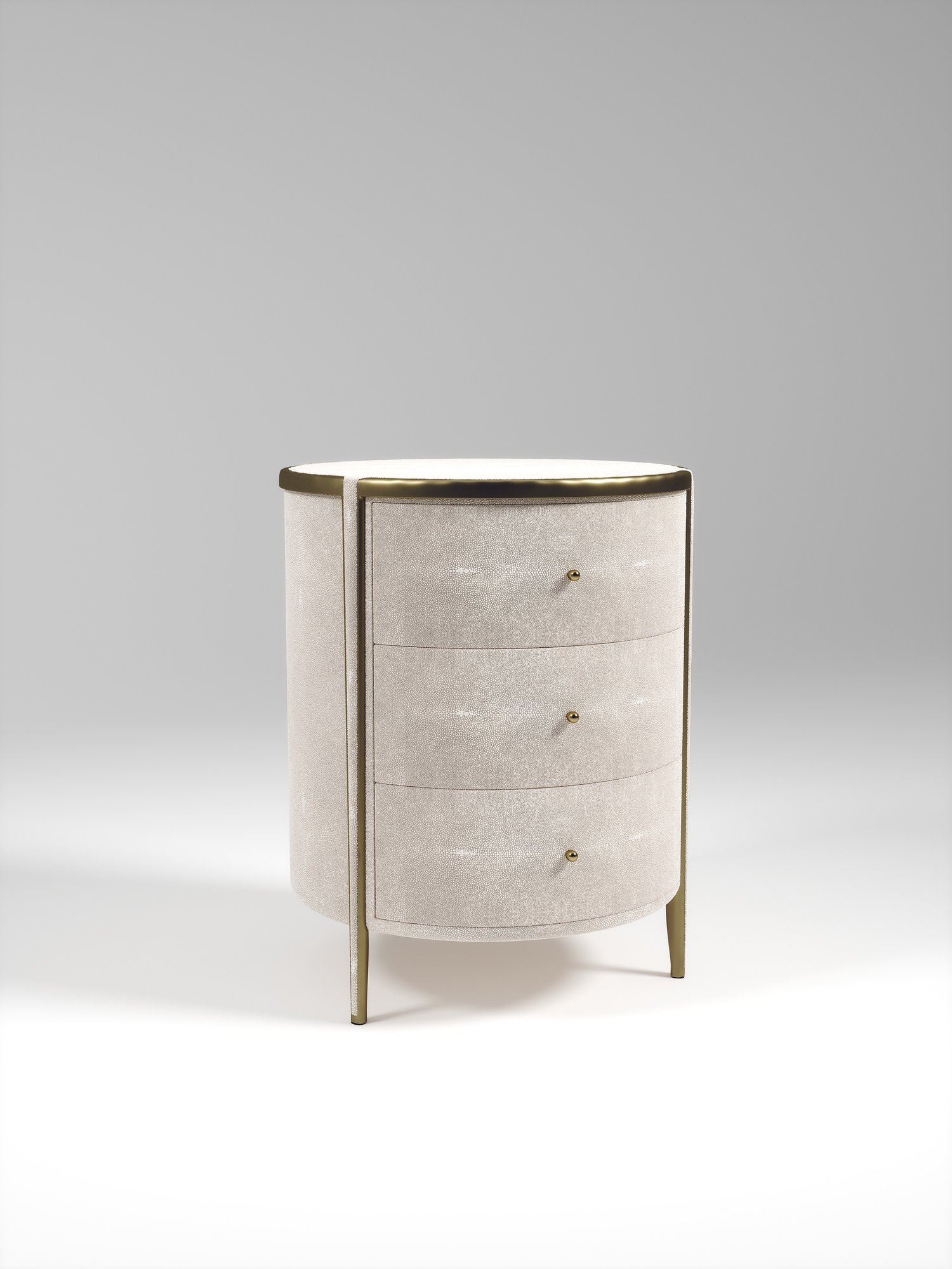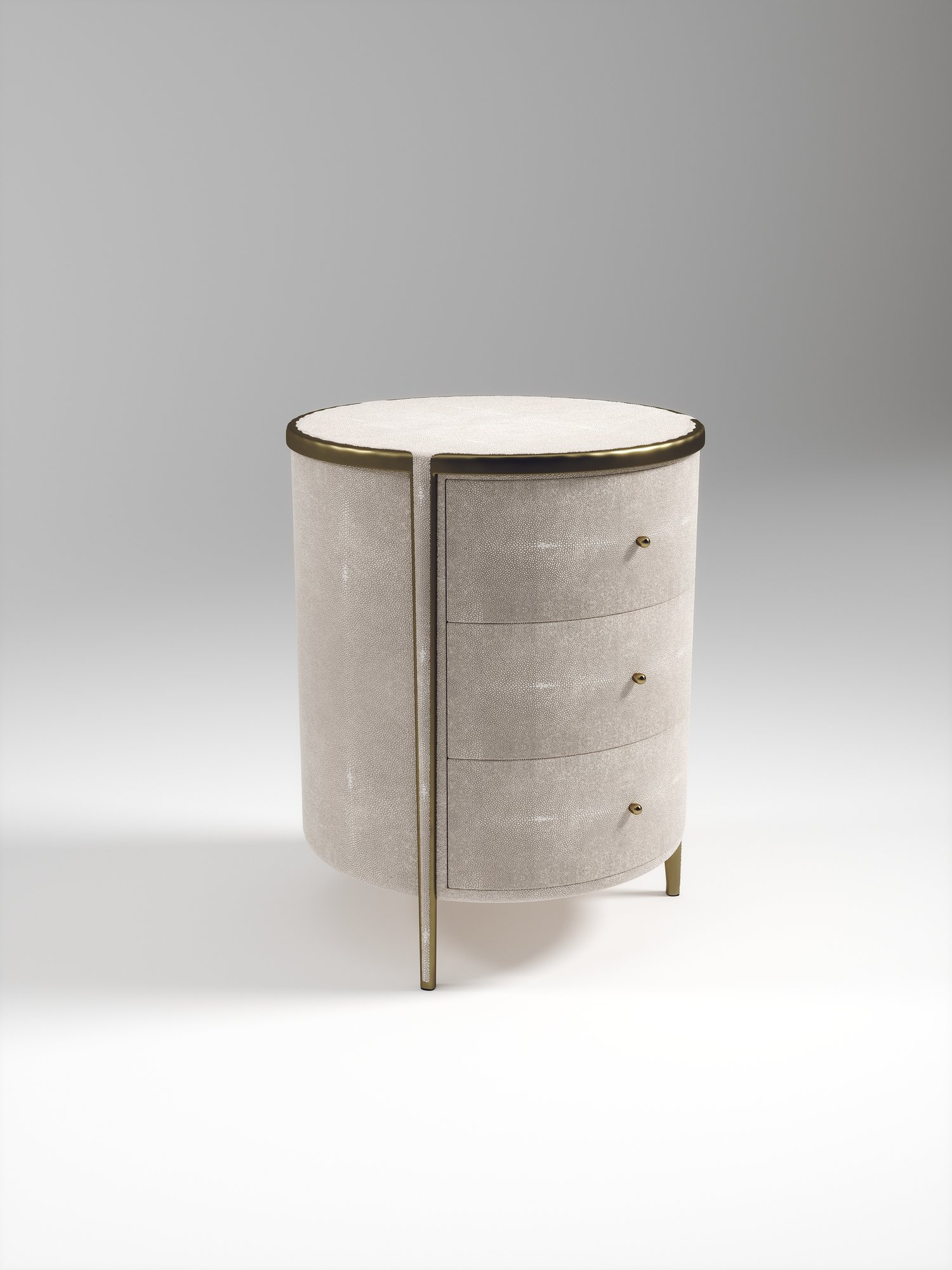 The Melting Round Bedside Table by R&Y Augousti is an elegant piece for any space. The cream shagreen inlaid piece is classic, but accentuated by their signature organic melting bronze-patina brass frame. This side table includes 3 drawers. This piece is part of the Melting Capsule. Available in other finishes.