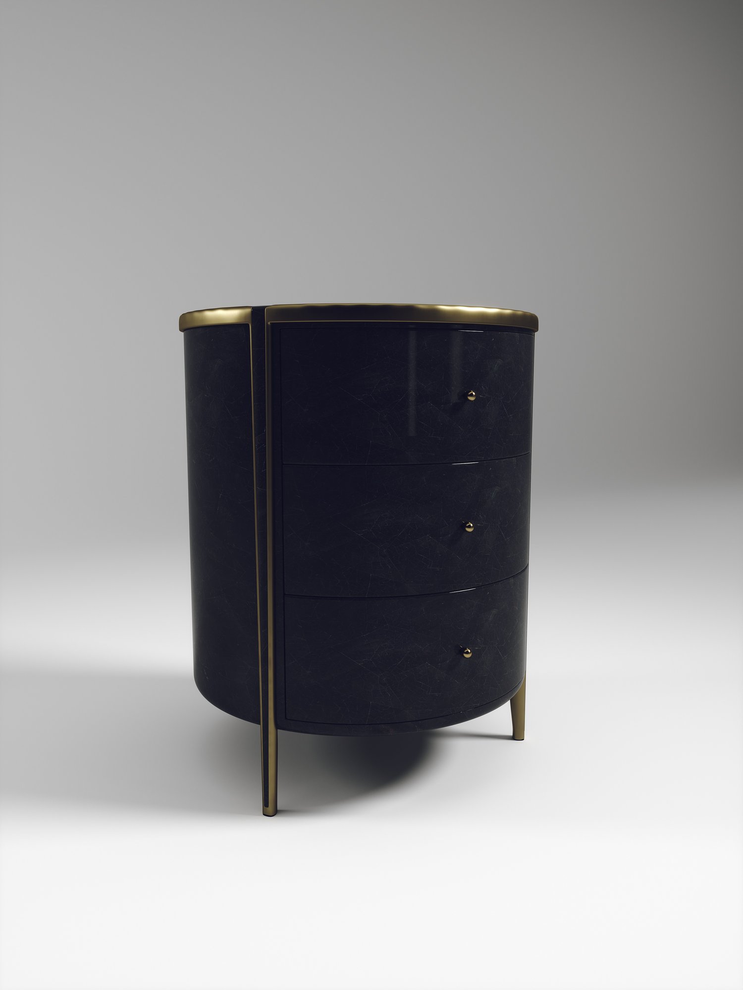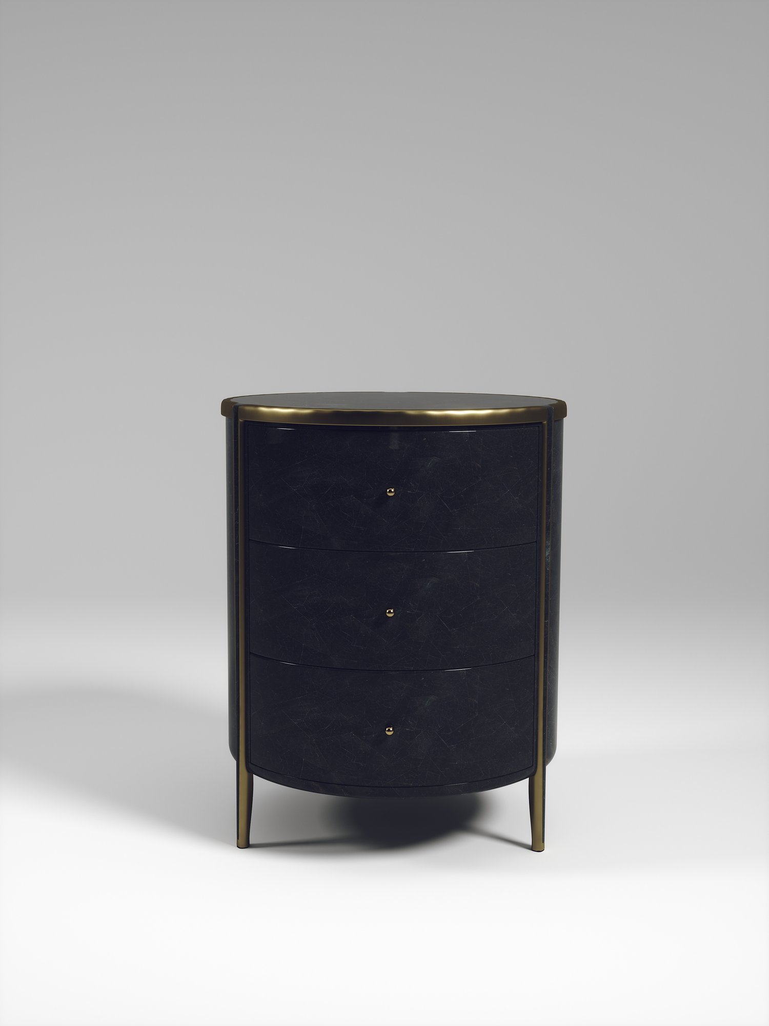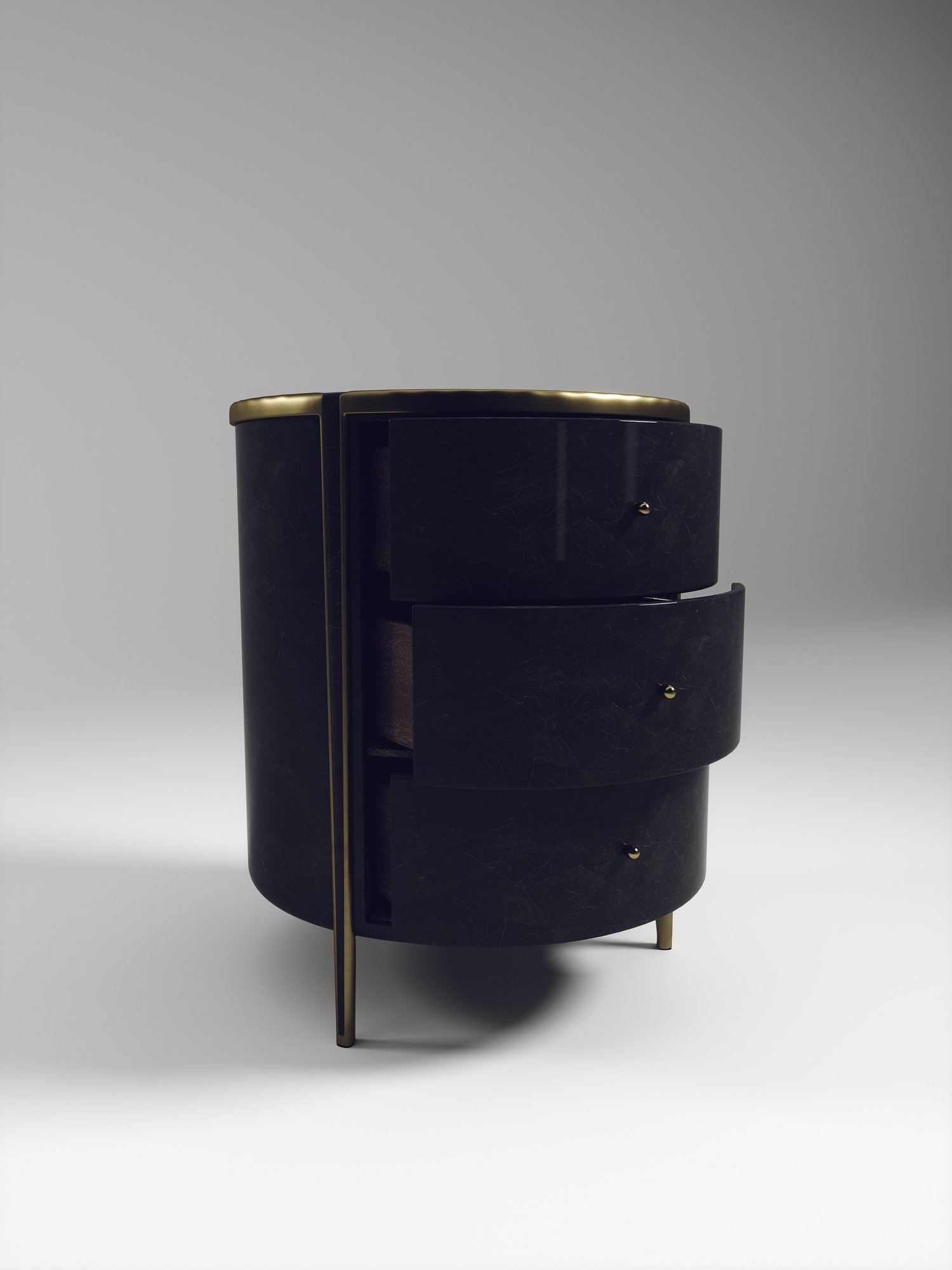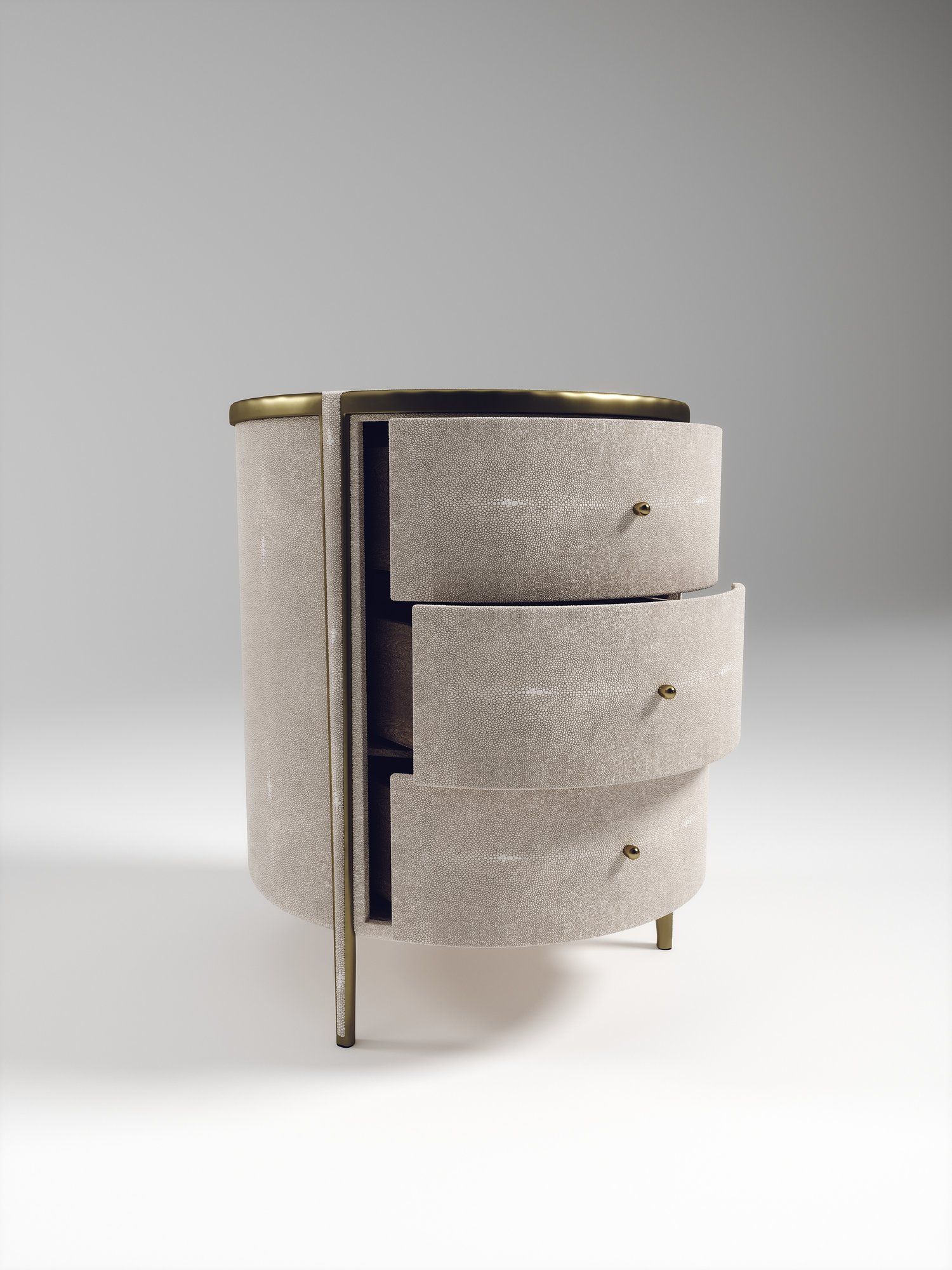 The Melting Round Bedside Table by R&Y Augousti is an elegant piece for any space. The cream shagreen inlaid piece is classic, but accentuated by their signature organic melting bronze-patina brass frame. This side table includes 3 drawers. This piece is part of the Melting Capsule. Available in other finishes.