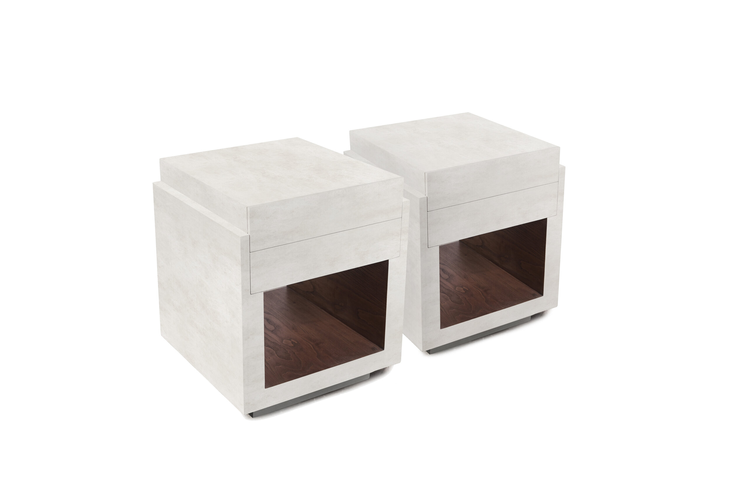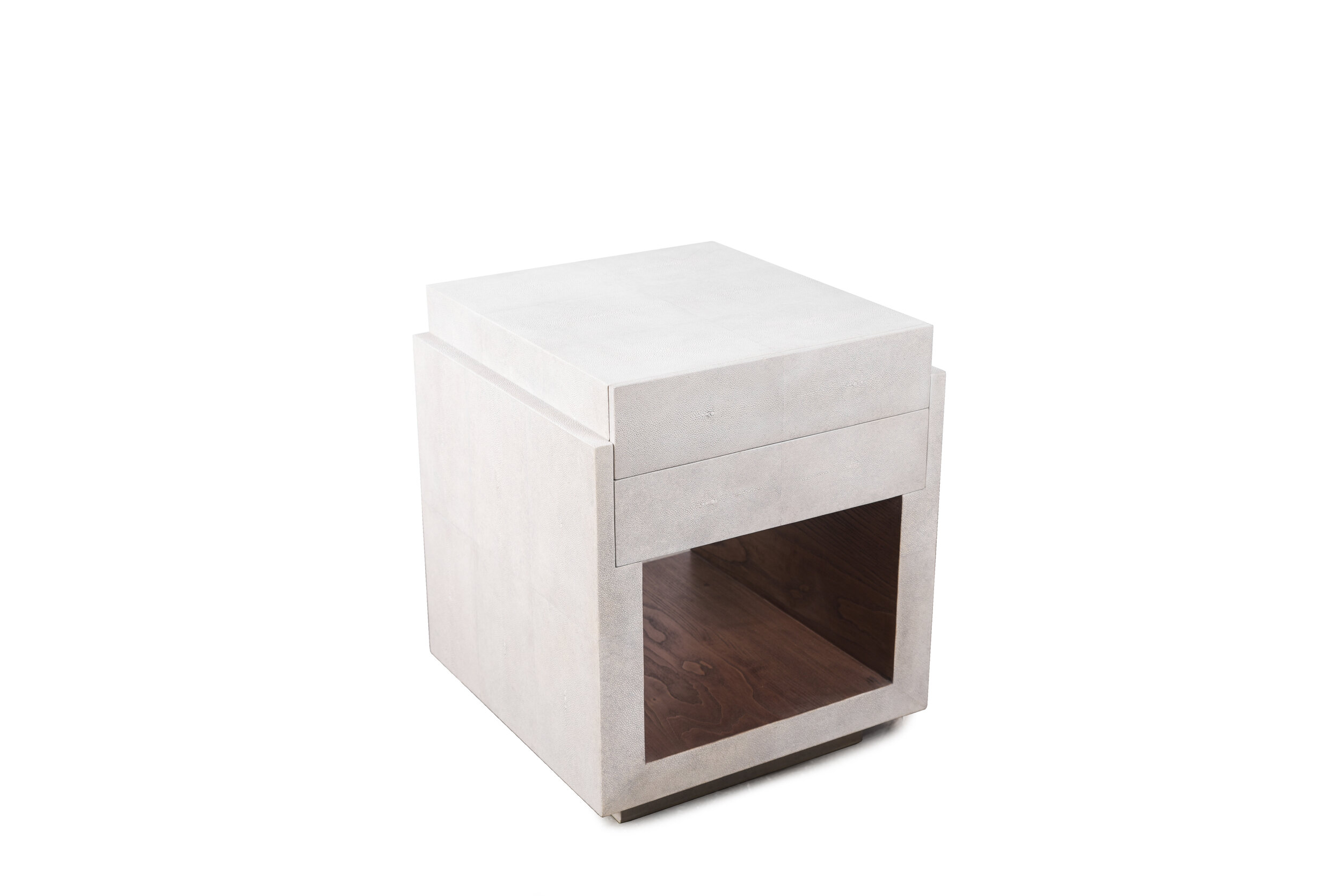 The tomboy bedside by R&Y Augousti is an elegant piece with its subtle geometry. This bedside table is completely inlaid in a mixture of cream shagreen and gemelina wood veneer in the shelf opening. This bedside table includes two drawers and a lower open shelf.