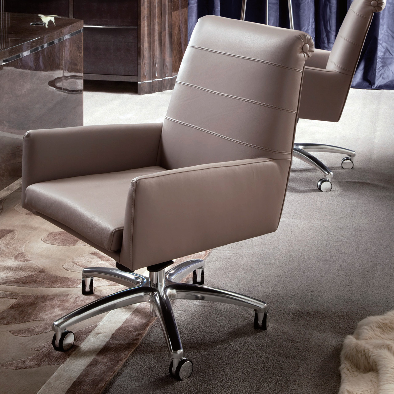 Guest office chair completely in leather, nubuk leather, velvet or suede fabric, on wheels with adjustable height. Leather needs: mt. 4,50 Nubuk leather needs: mt. 6,00 Fabric needs: mt. 3,00