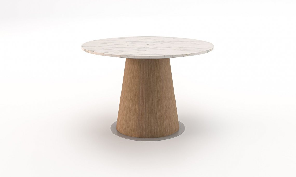 Duomo is the perfect meeting table for the office environment. It’s very adaptable, perfectly at home in a meeting room or used in a private office as an accessory table to the main desk. The supporting structure forms a single semi-conical volume composed of wood-lined metal. The structure can be easily accessed if and when it’s necessary to carry out some quick maintenance on the electrical system. The Carrara marble top possesses a central metal-lined hole for easy cable routing: maximum functionality combined with a clean, essential aesthetic. As it has a single central leg, a metal sub-top provides the table with added stability and, in matching the circular metal ground support base, it simultaneously bestows a touch of formal elegance.