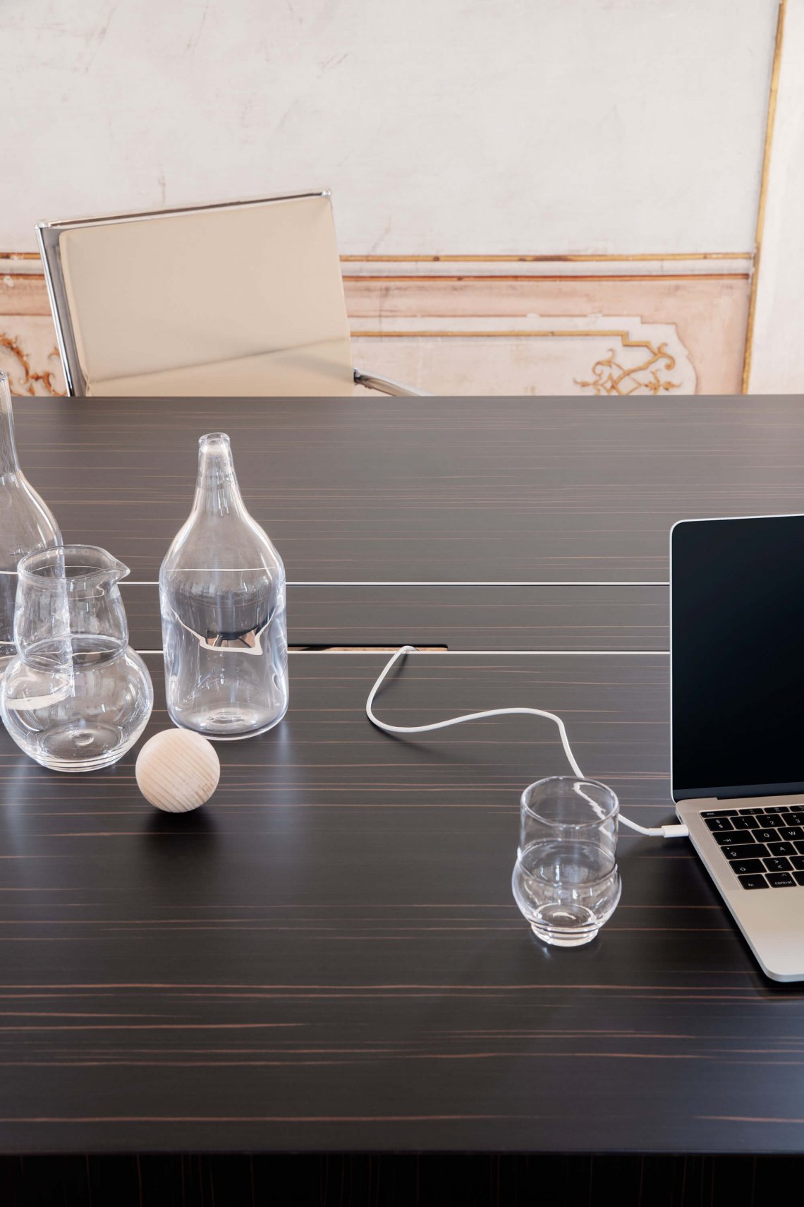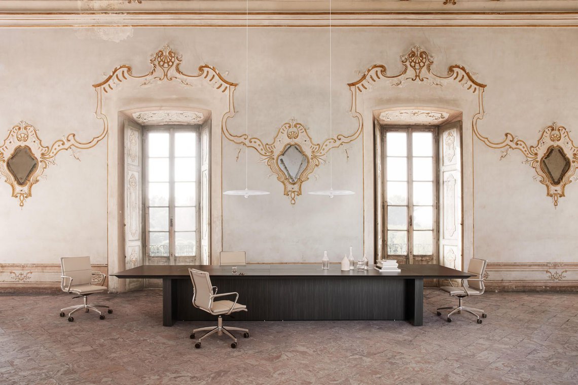 More is a system of tables for executive offices and meeting rooms, with a refined style. It is characterised by important volumes and a harmonious alternation between massive elements and light surfaces. A central architectural element connects the technical volumes and the work surfaces. Side cabinets and worksurface electrification complete the system.