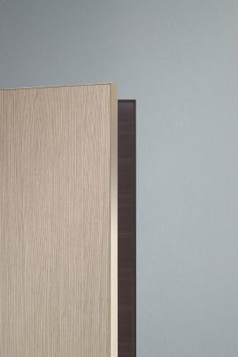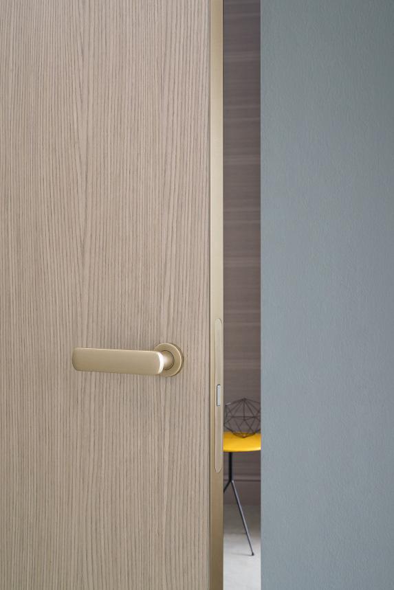 Swing wood door, with aluminium edge, 55 mm thick. Magnetic lockset, concealed hinges and anti-noise gasket included. Anodized aluminium frame to be installed without any subframe.