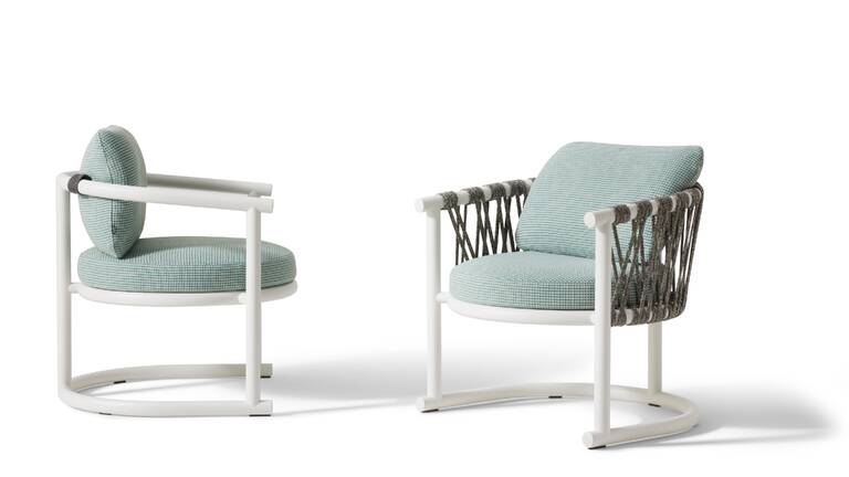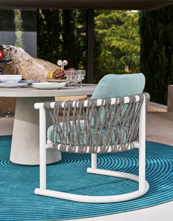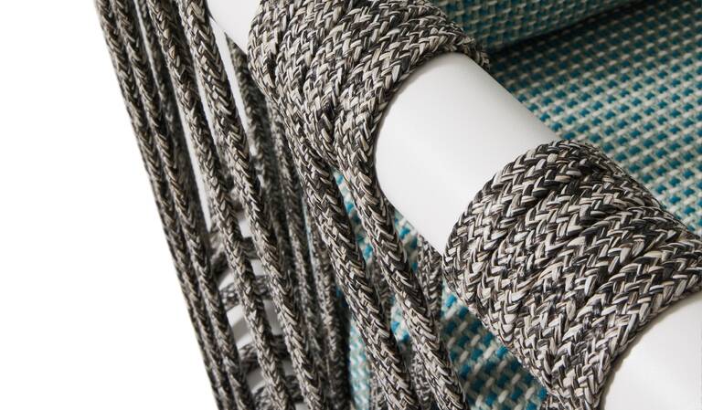 Patricia Urquiola設計的這款休閑扶手椅充滿地中海風情,與專為舒適的戶外生活而設計的家具系列相呼應,是對當代休閑生活的高雅邀請。鋁管椅面和靠背上纏繞著手工編織的聚丙烯繩。柔軟的可拆卸座墊底部由三條尼龍搭扣帶進行固定。在無編織款式中,靠墊通過拉鏈與座墊相連,并由兩條聚丙烯帶通過不銹鋼按扣掛在框架上。