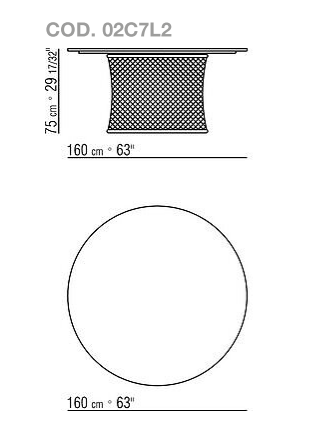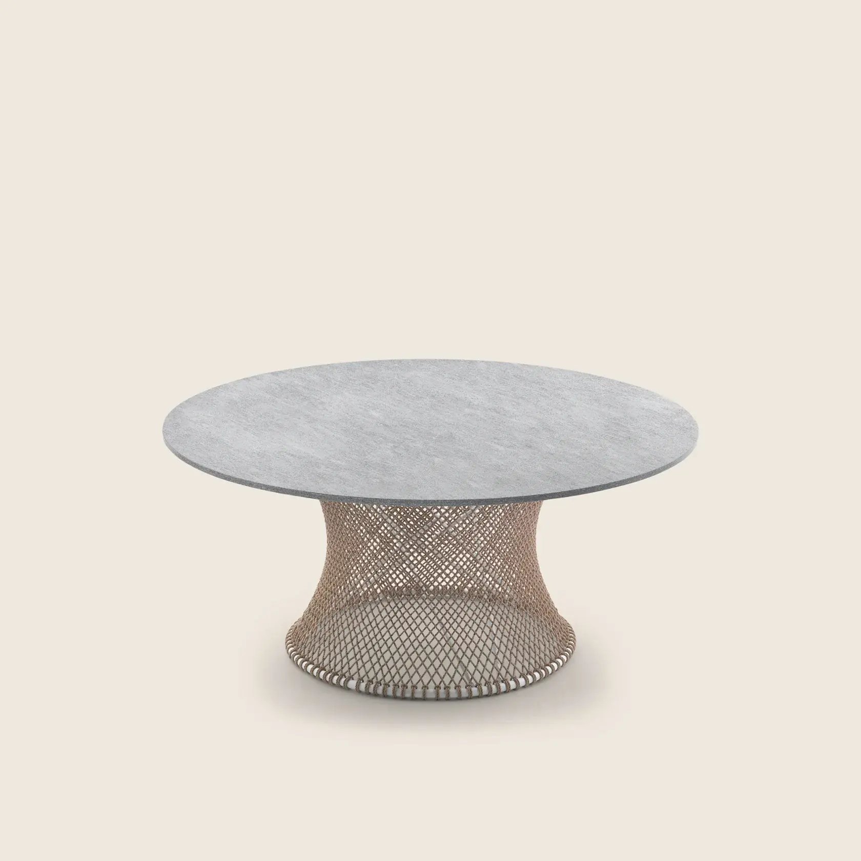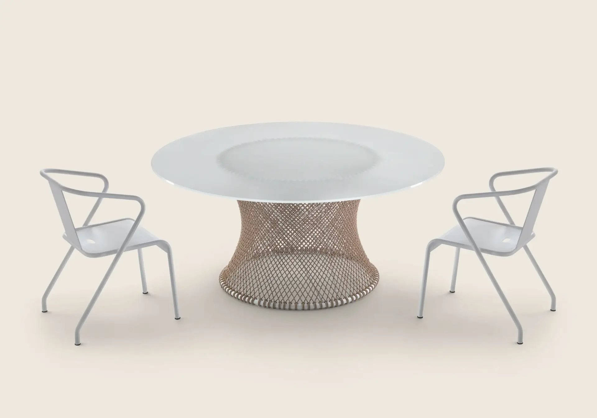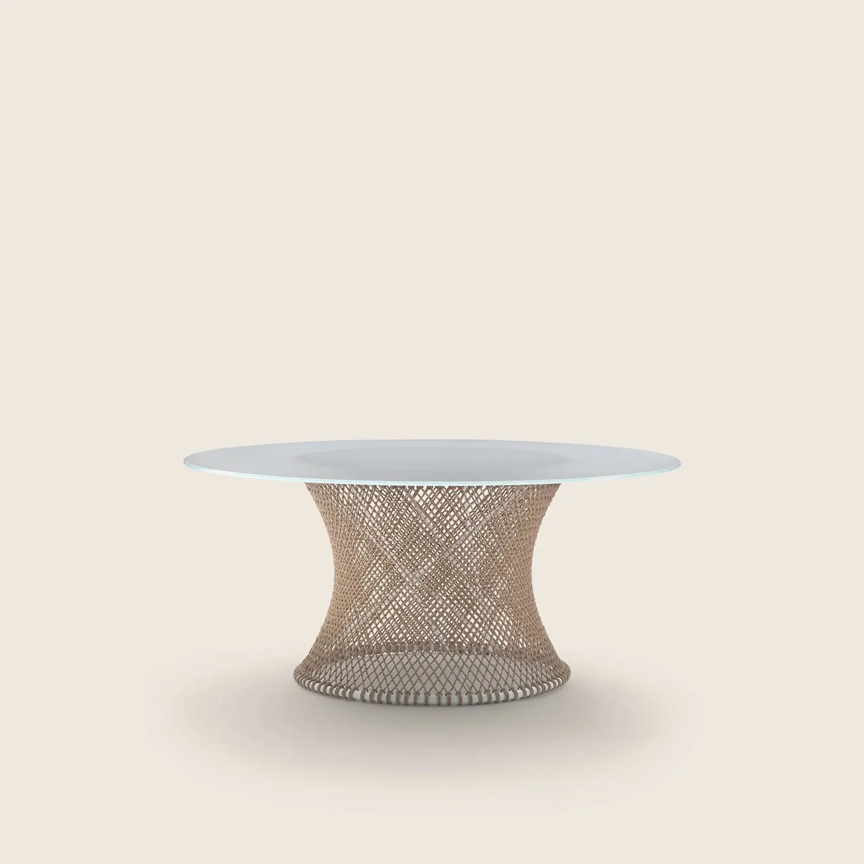 The delicate woven mesh pattern, sinuous metal structure and tempered-glass top lend elegance and lightness to the design.