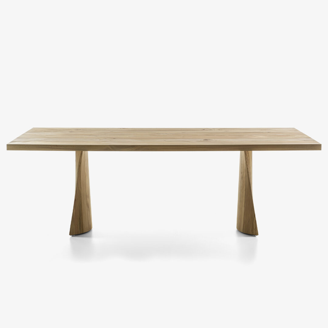 Versione per outdoor, in legno massello di cedro profumato del Libano. Top a liste accostate con bordi smussati. La forma del basamento nasce da un gioco di linee curve e rette che ne donano leggerezza.