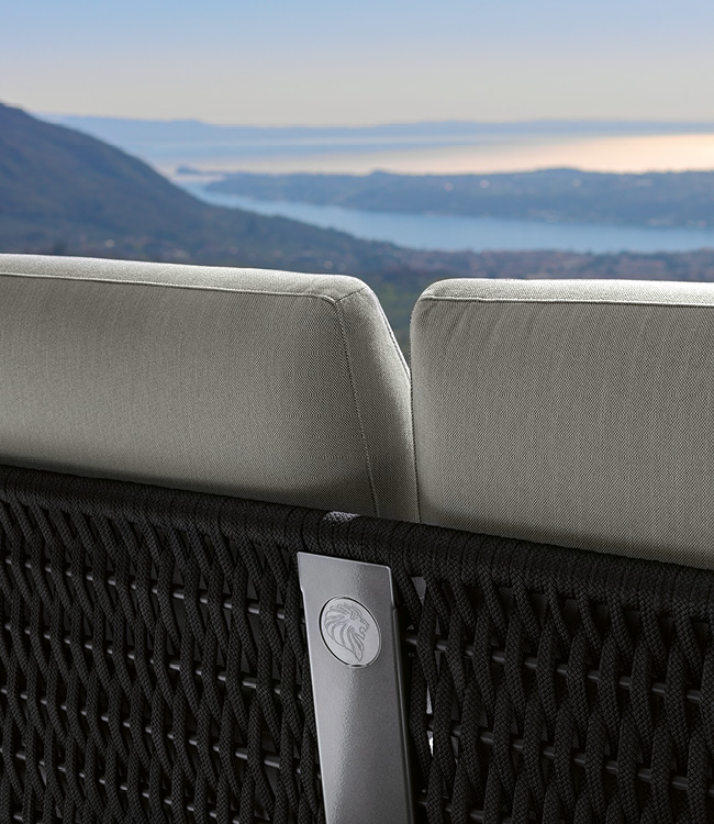 Sofa available in special treated fabric or first grade leather. Cushion filling in waterproof dacron. Structure in combination of satined black metal with inserted Giorgio Collection logo and light grey or black woven cordage.