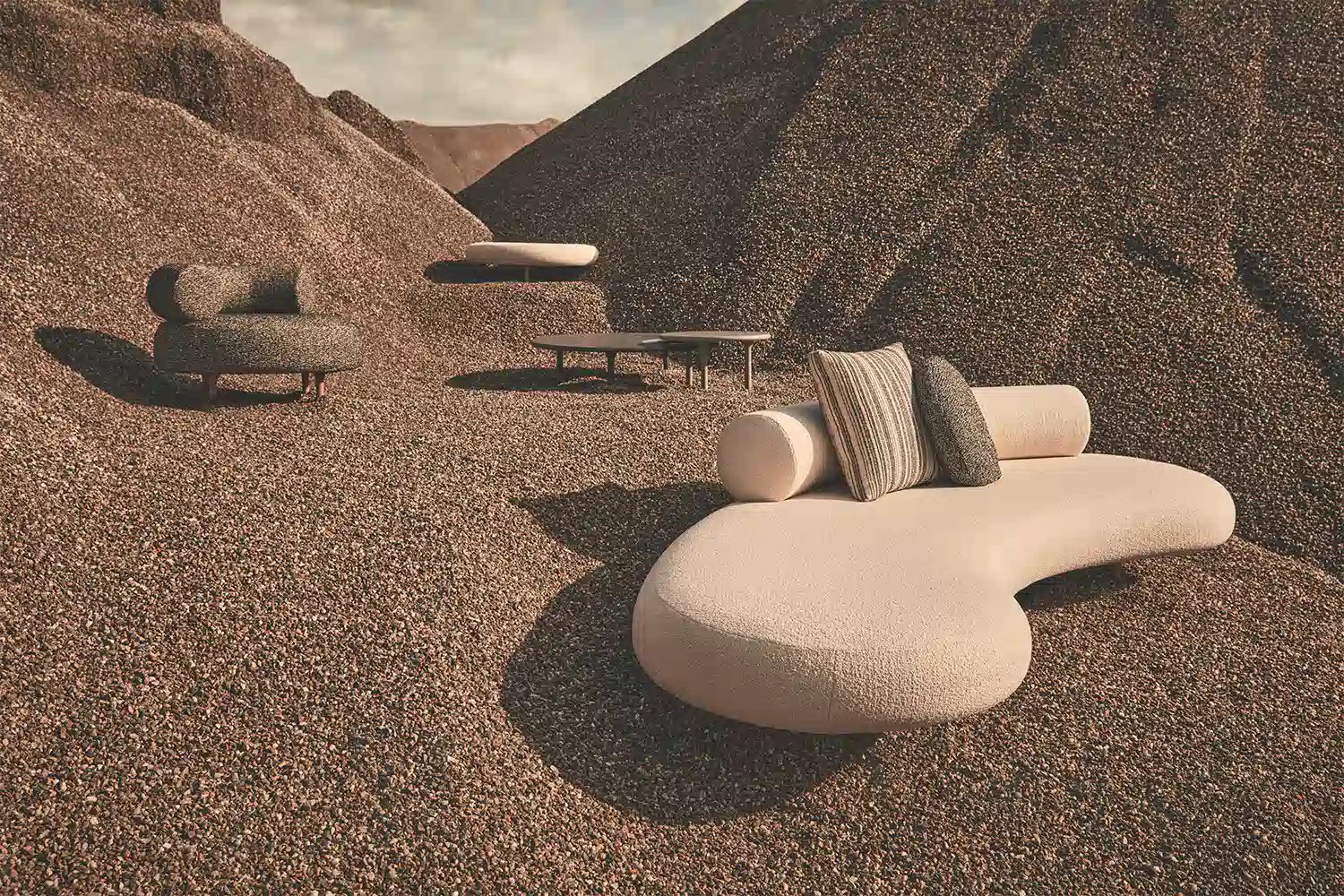 All that changes is the setting: Elisa Ossino steps outside the home and takes the virtues of her interior chair and table collection into the open air. The sofa and armchair share the same fluid forms but upholstered in a durable outdoor polypropylene fabric particularly pleasant to the touch, and featuring Iroko feet. The coffee tables, which can be paired to create new iconographies, are in Granito Nero Assoluto and Quarzite Grigia, treated with Olio Idro.