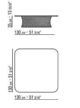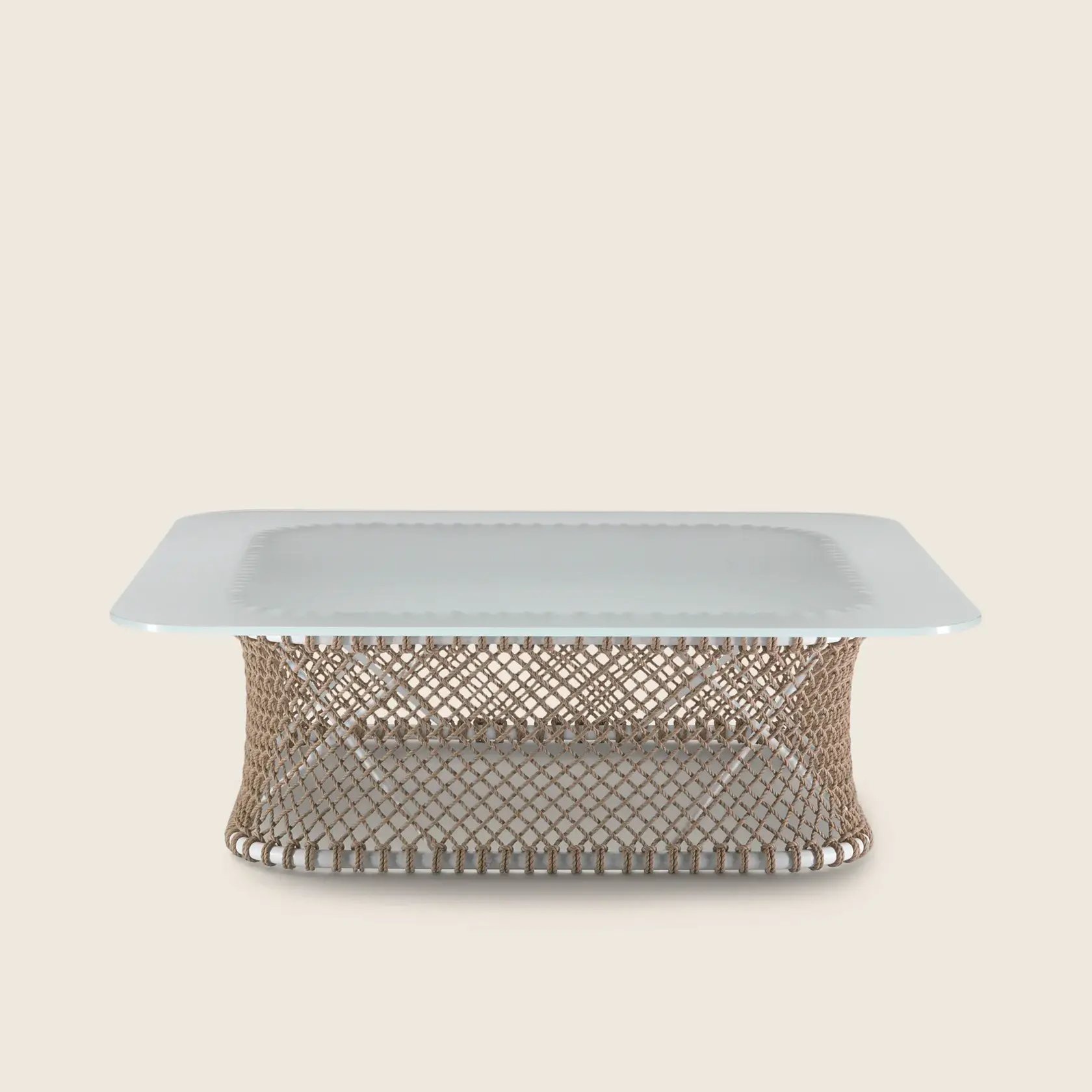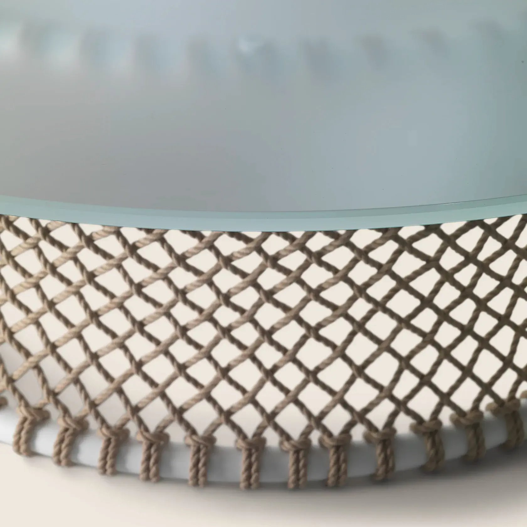 The delicate woven mesh pattern, sinuous metal structure and tempered-glass top lend elegance and lightness to the design.