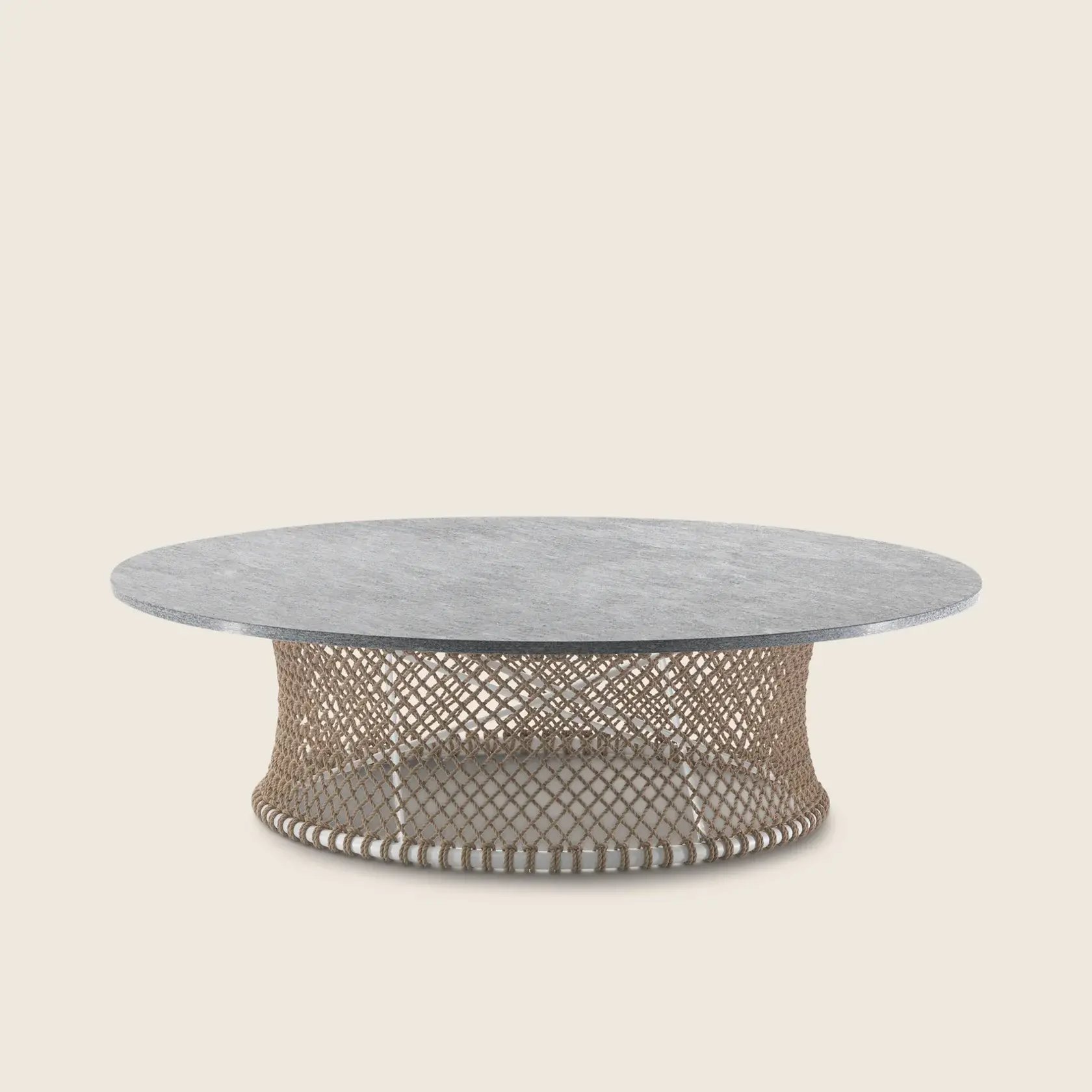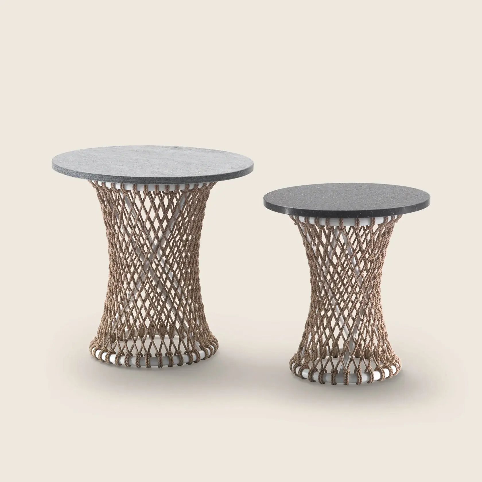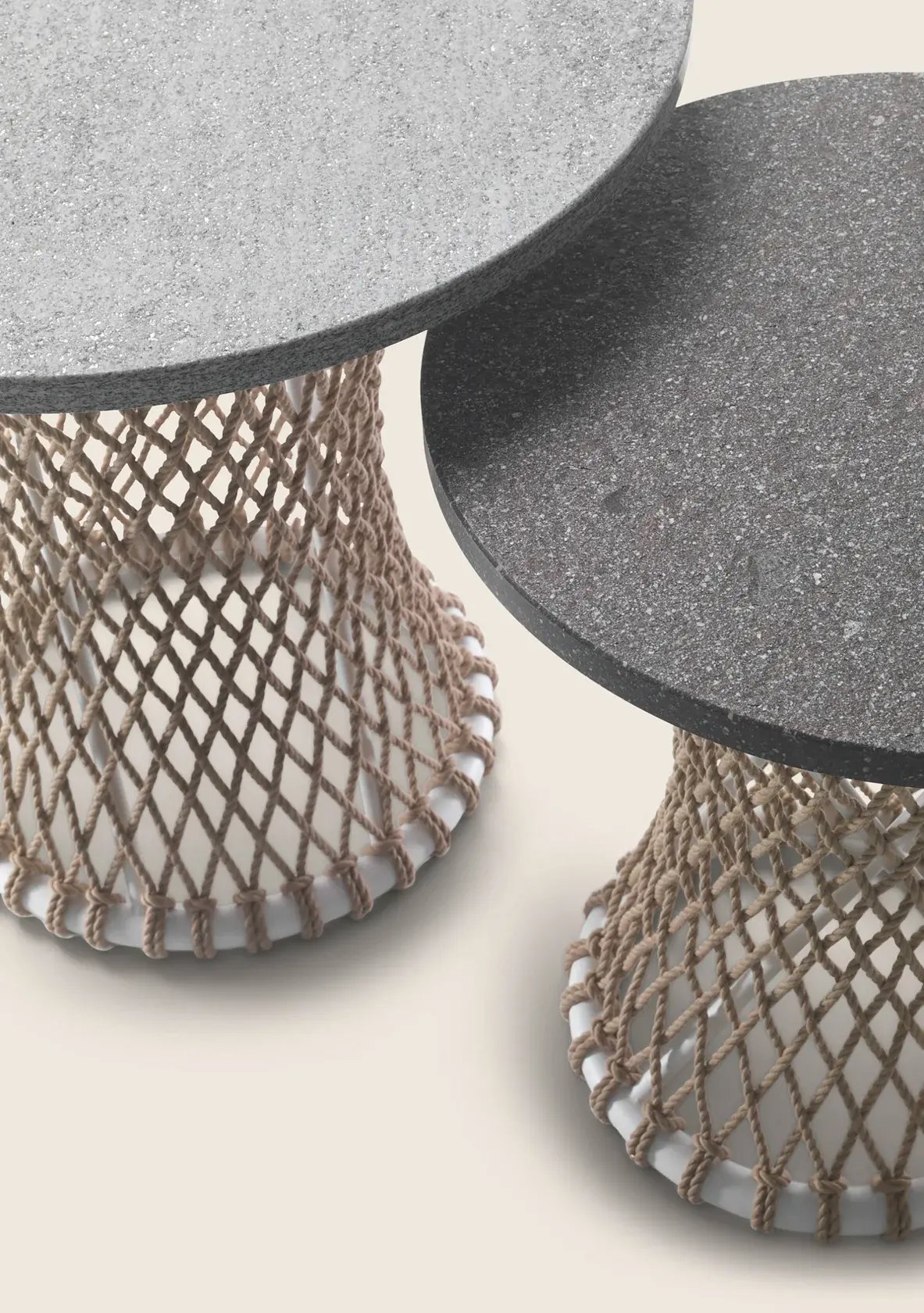 Its originality lies in the epoxy powder-coated tubular metal base with entirely hand-woven polypropylene or rubber cord.