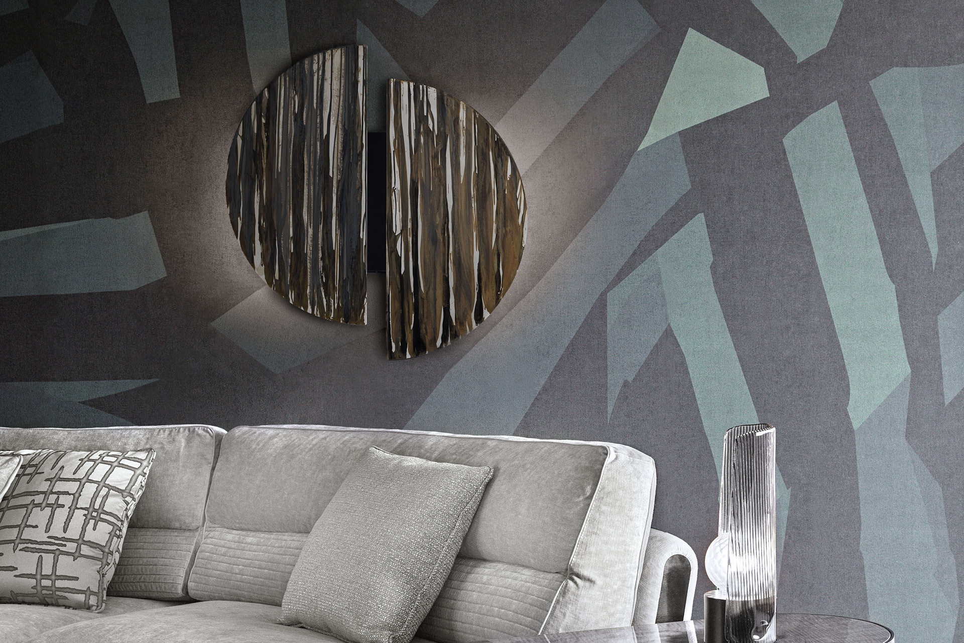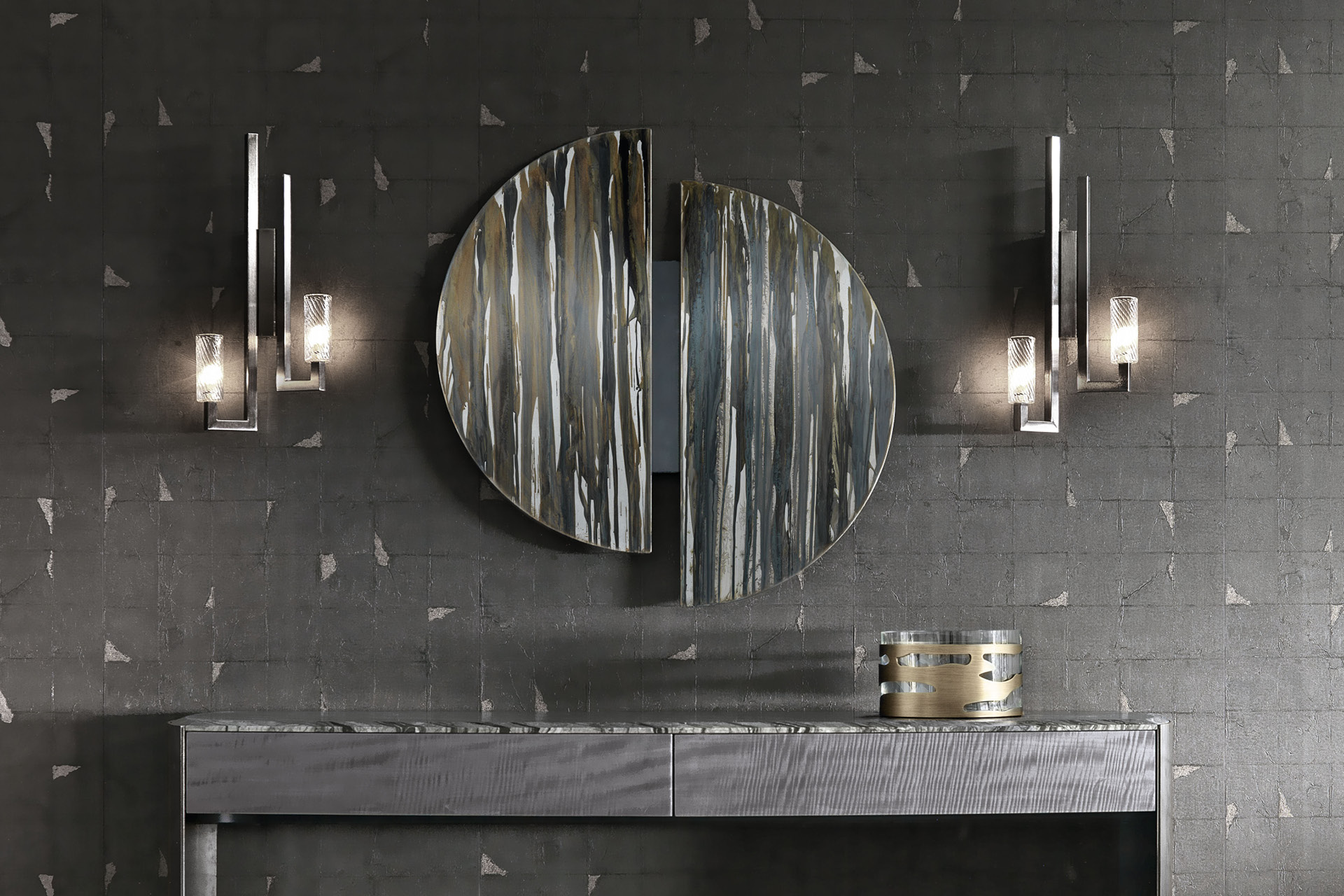 Round metal painting with hand painted details.