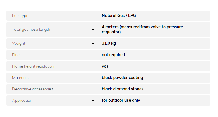 Galio Black is a linear gas fireplace of a sleek black look that will blend in perfectly with any style of your outdoor space. Its unique design and portable form will create a convenient and easy in use decoration of your garden. Depending on the fuel type chosen, the maximum heat output of this linear outdoor gas fireplace may vary from 9.4 kW (LPG) to 11.8 kW (NG) providing you with a pleasant heat.
