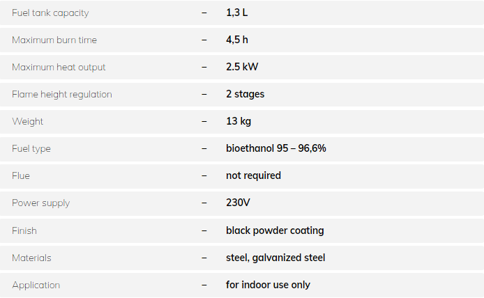 Senso Basket is a bioethanol fireplace, suitable for smaller indoor spaces. The flame has two levels of height, so you can either enjoy the fire for many hours or raise the room temperature by a few degrees. The Plug&Play system will start the fire quickly and safely, preventing close contact between the user and the flame.