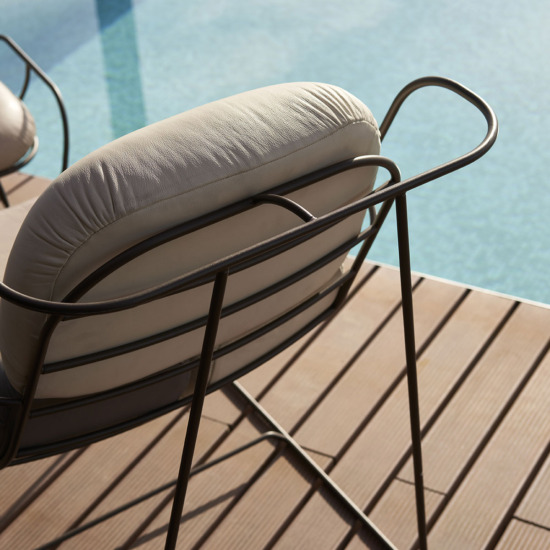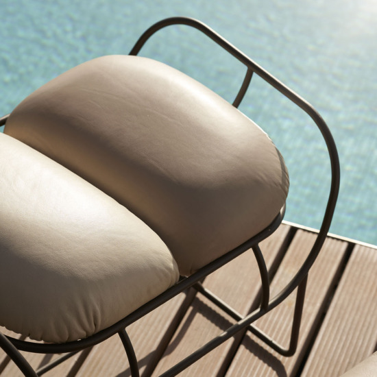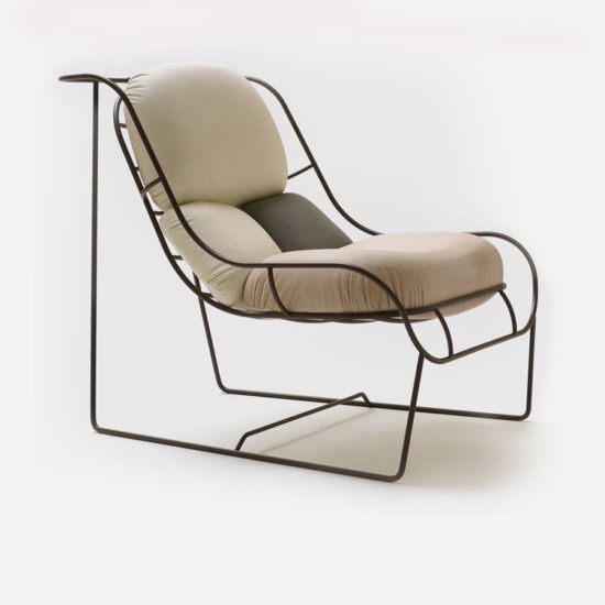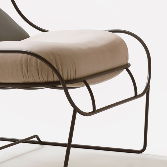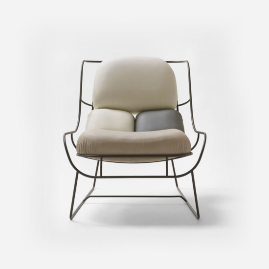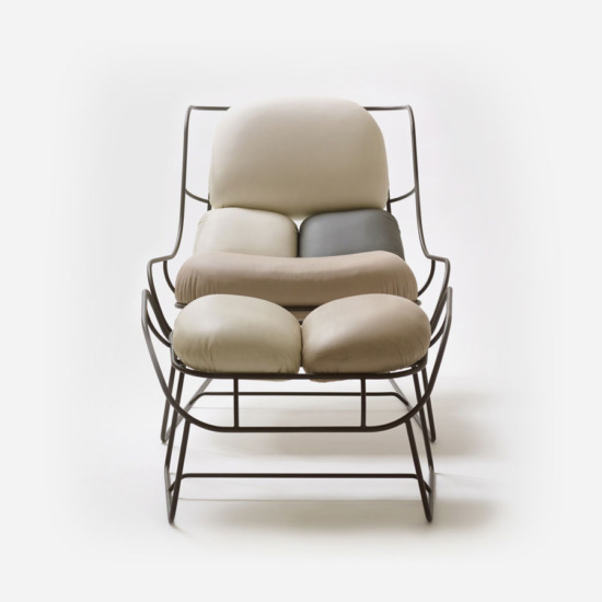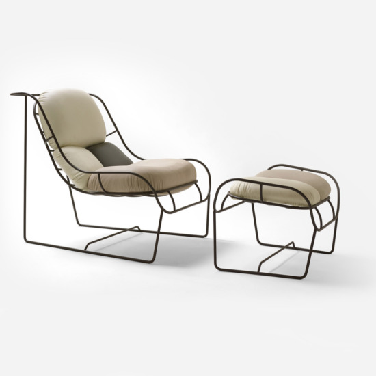 In the context of Nigel Coates’ growing interest in furniture, the Plasma armchair reflects the English designer’s taste for designing essential forms by digital means. Composed of a set of cushions in different tones placed on a slender metal structure with harmonious curves, Plasma combines the simplicity of a continuous graphic sign with the complex technology of the structure, made with computerized methods of bending and welding. With a footrest, it is also available for outdoor use.