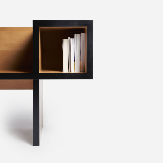 The Canton wooden bench, designed by Franco Raggi in 1988, fitted out with two spaces on the sides—containers for magazines, books and phone directories, still in use at the time—ideally designed for home entrances, ?was born, —Franco Raggi writes—, from a graphic exercise: a black line which in its continuous path creates two squares connected by a horizontal line. Dragging this line into the third dimension, I realised that the solid thus obtained could be a bench, not a comfortable seat, but for temporary use, where ergonomics could be sacrifice in favour of an abstract, almost neoplastic image. Books and things could be put in the squares transformed into open compartments.?