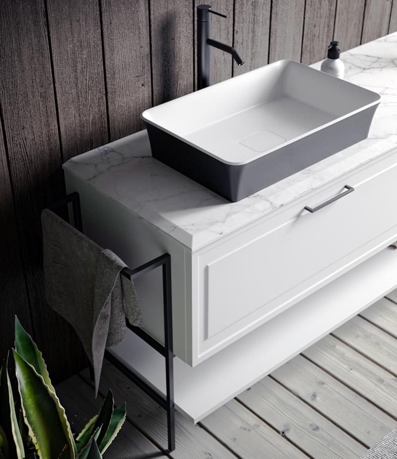 “Structura” is the metal element that supports the base with drawers and shelf, also available in the version with integrated towel holder, which adds practicality to the whole. Finishes: L001M Matt White, Structura S01 Matt Black, Top Carrara Marble. Overall: W.2035 D.520 mm
