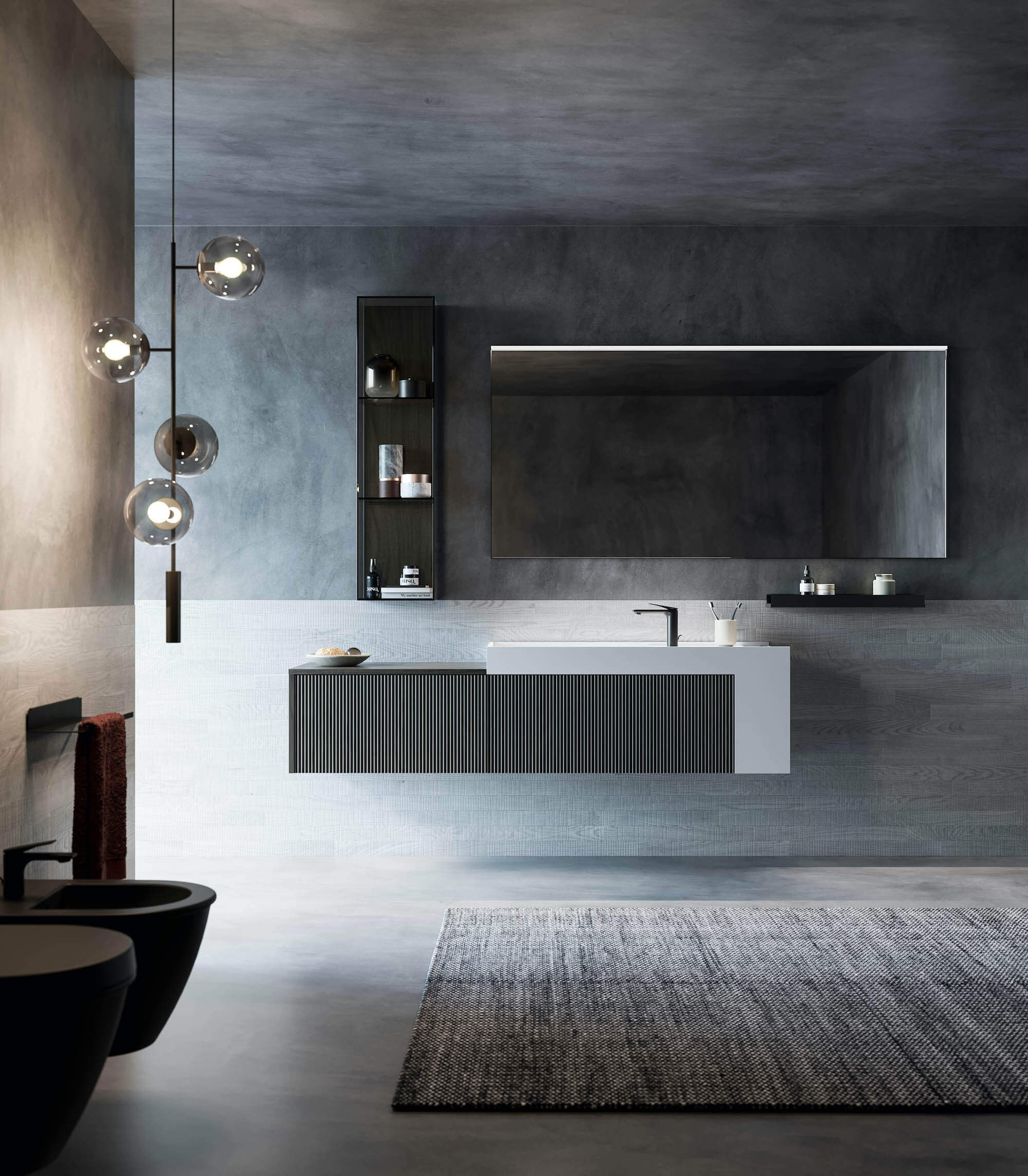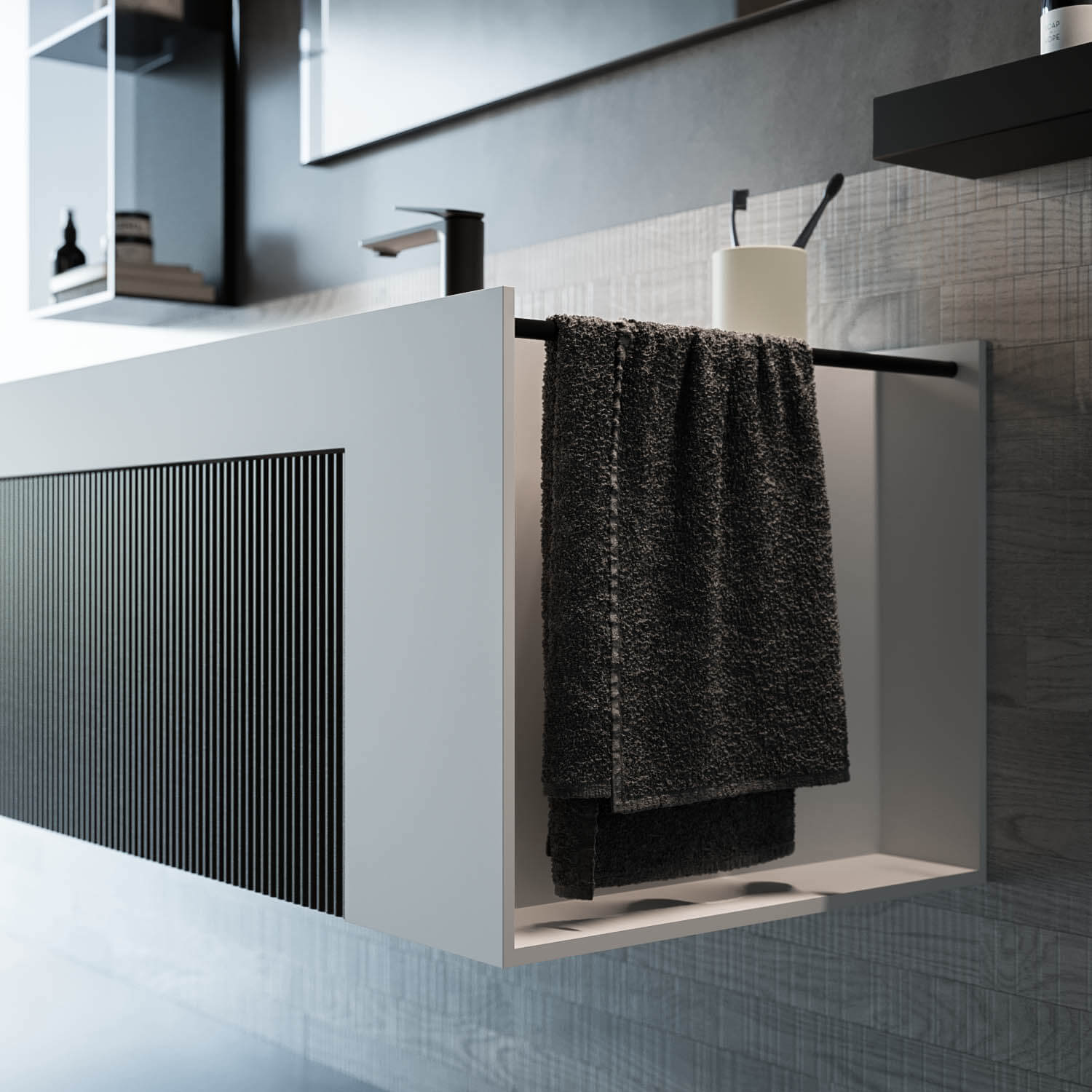 The Vertigo cabinet looks like an element embedded in the WRAP solid surface washbasin. An exclusive PUNTOTRE washbasin with essential lines that catches the eye with its purity, remaining practical and usable in its exclusivity. The WRAP washbasin also conceals an exclusive towel rail function.