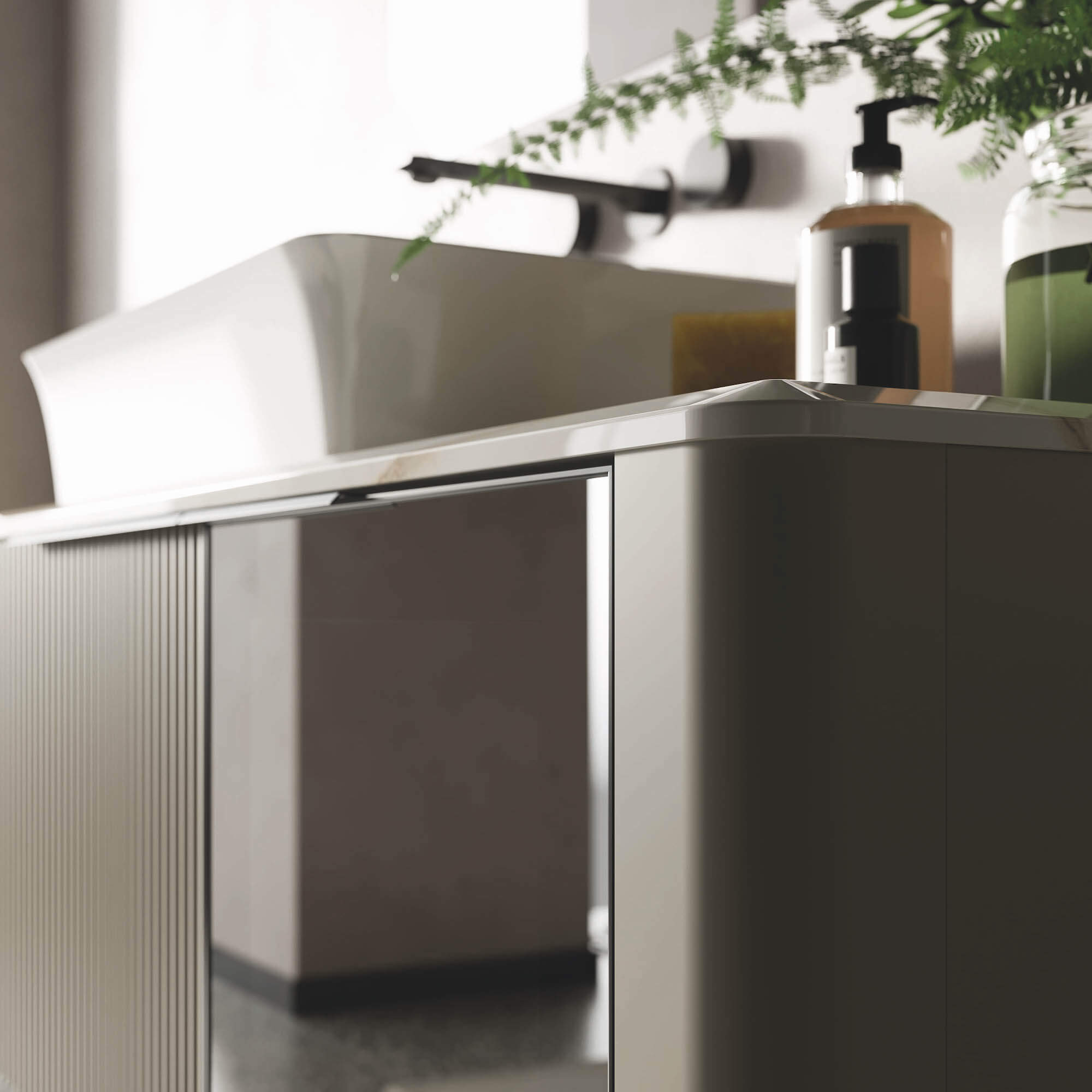 The grazing light highlights the interplay of the three-dimensional volumes of the VERTIGO fronts, while the OTTAGONO BIG mirror helps to reinforce the mix of modern and classic in this ART-inspired solution. Note the elegance of natural stone with optional bevelled profile, a touch of exclusivity in a fascinating piece of furniture.