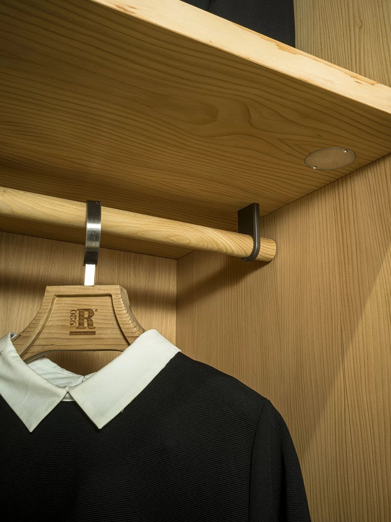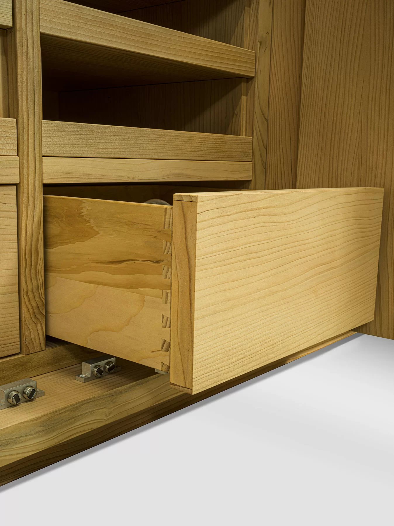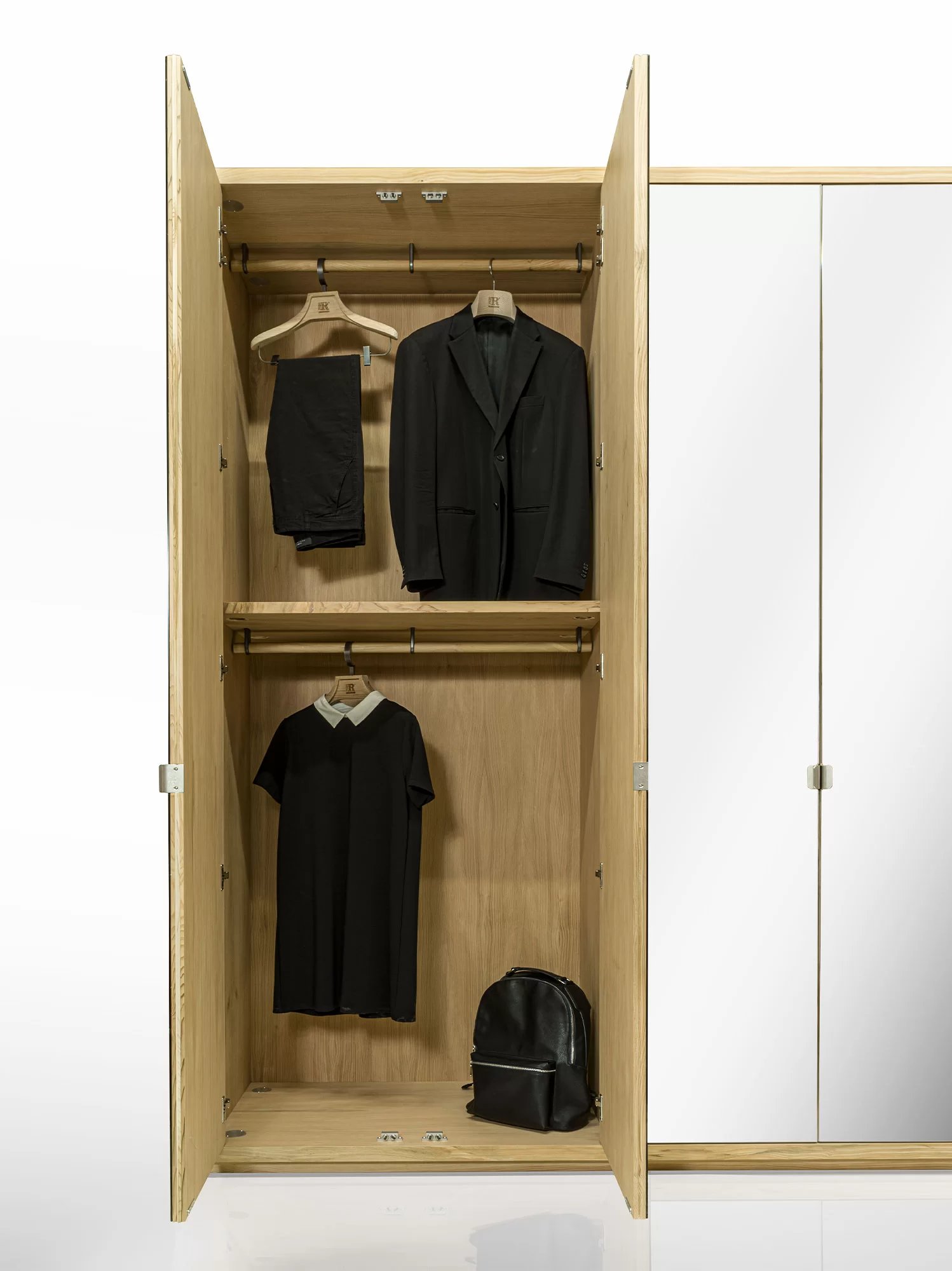 Armadio in legno massello e listellare, caratterizzato da ante battenti a specchio e telaio in legno massello, con interni in legno di cedro profumato, naturale rimedio contro le tarme. Personalizzabile con l’inserimento di appendiabiti, ripiani, cassettiere in legno massello con tradizionale incastro a coda di rondine e accessori vari, propone un’organizzazione funzionale e componibile dei vari elementi sulla base delle esigenze contenitive e delle dimensioni richieste.