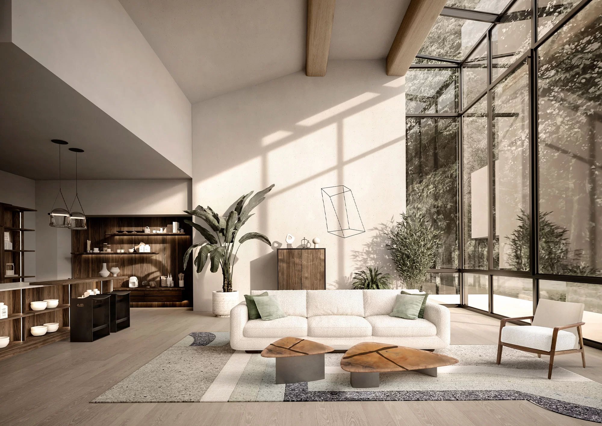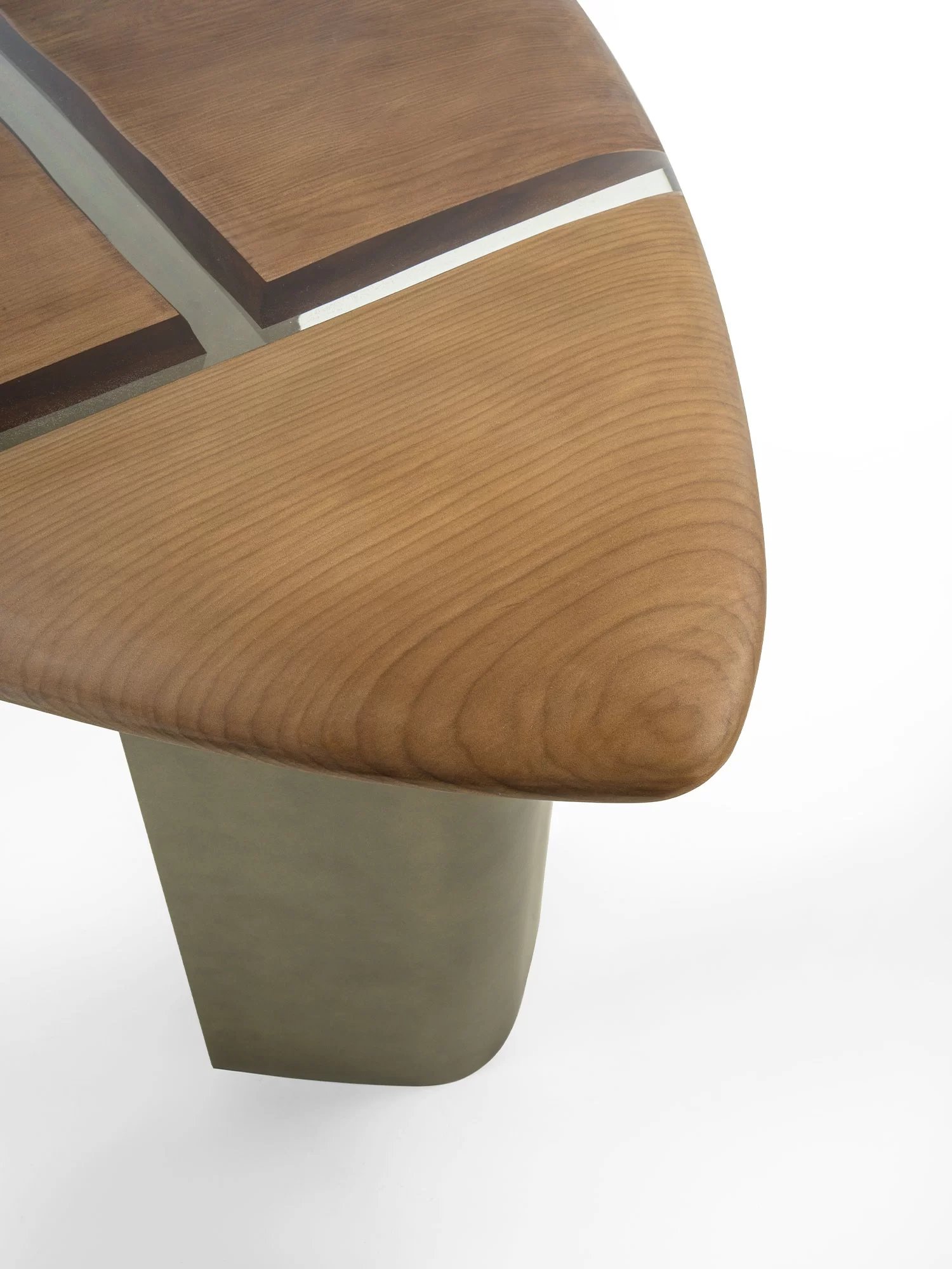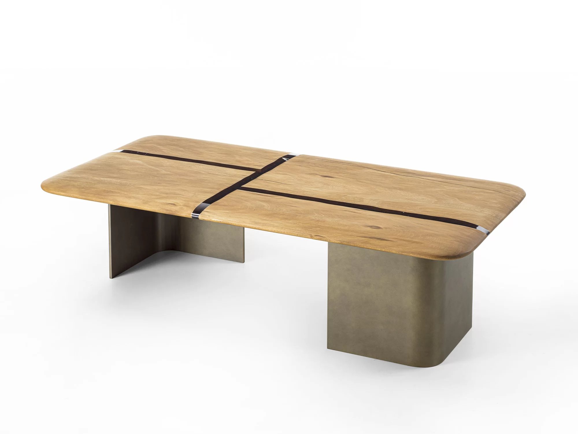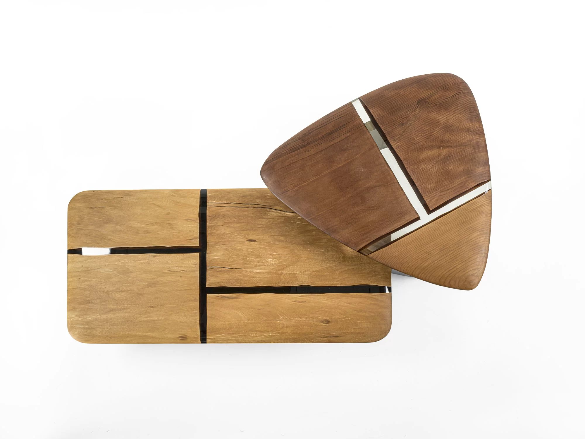 Tavolini il cui top nasce dall’accostamento di parti in legno di Kauri con inserti in resina, che insieme creano geometrie dinamiche e raffinate, abbinato ad una base in ferro, disponibile in due altezze. Gli spessori assottigliati tramite lavorazione a saponetta del top donano leggerezza e sinuosità.