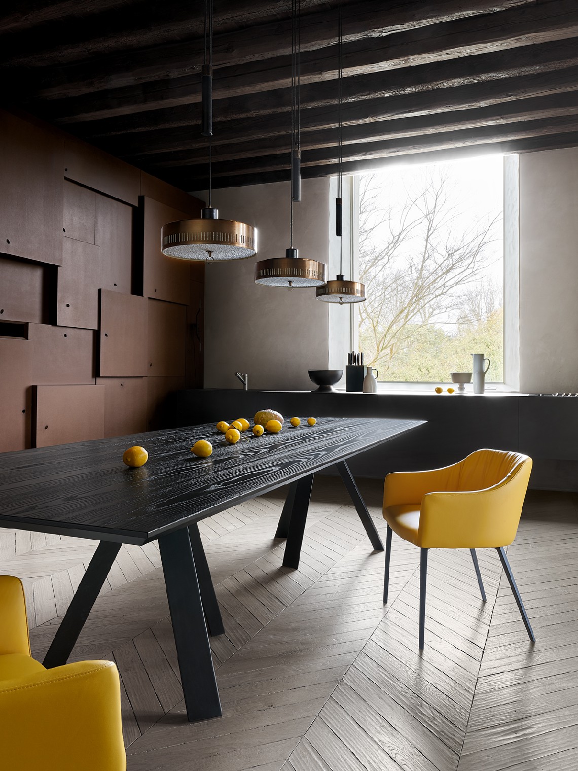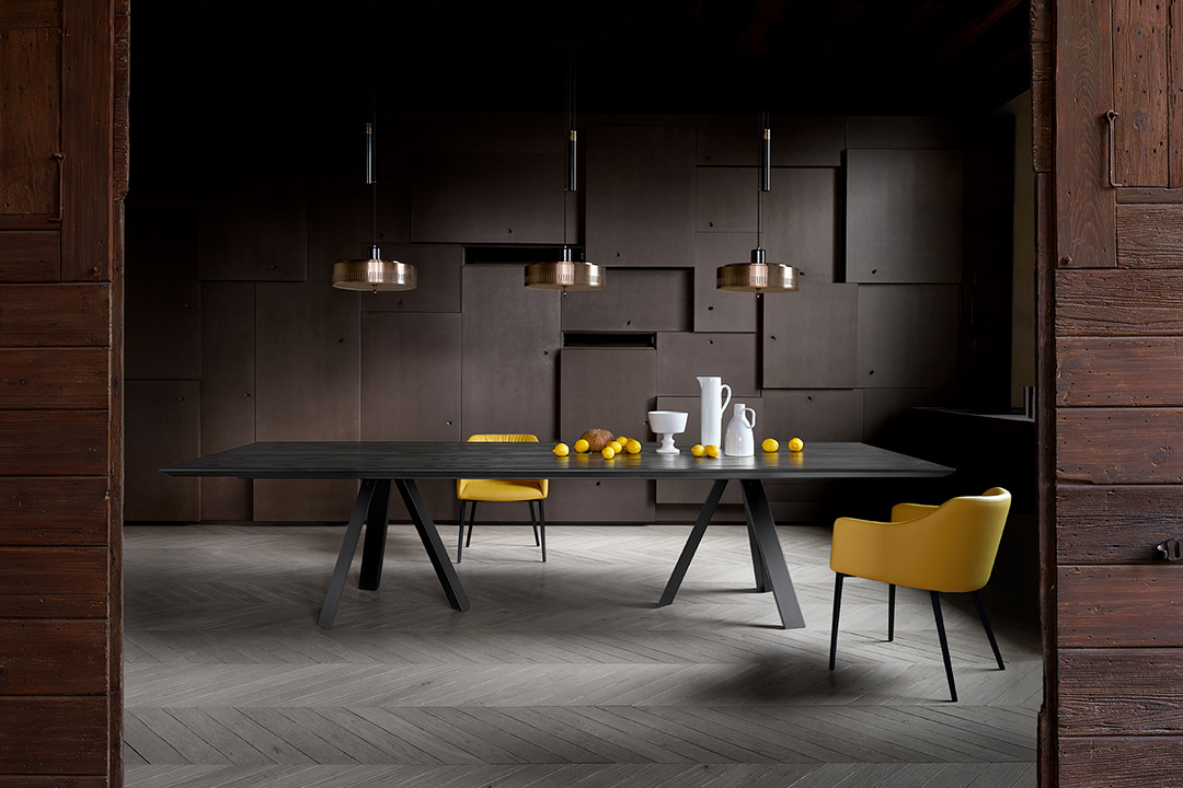Tavolo da pranzo extra-lungo, composto da due basi in metallo a raggiera ed un raffinato top in legno. Adatto sia per uso residenziale che contract.