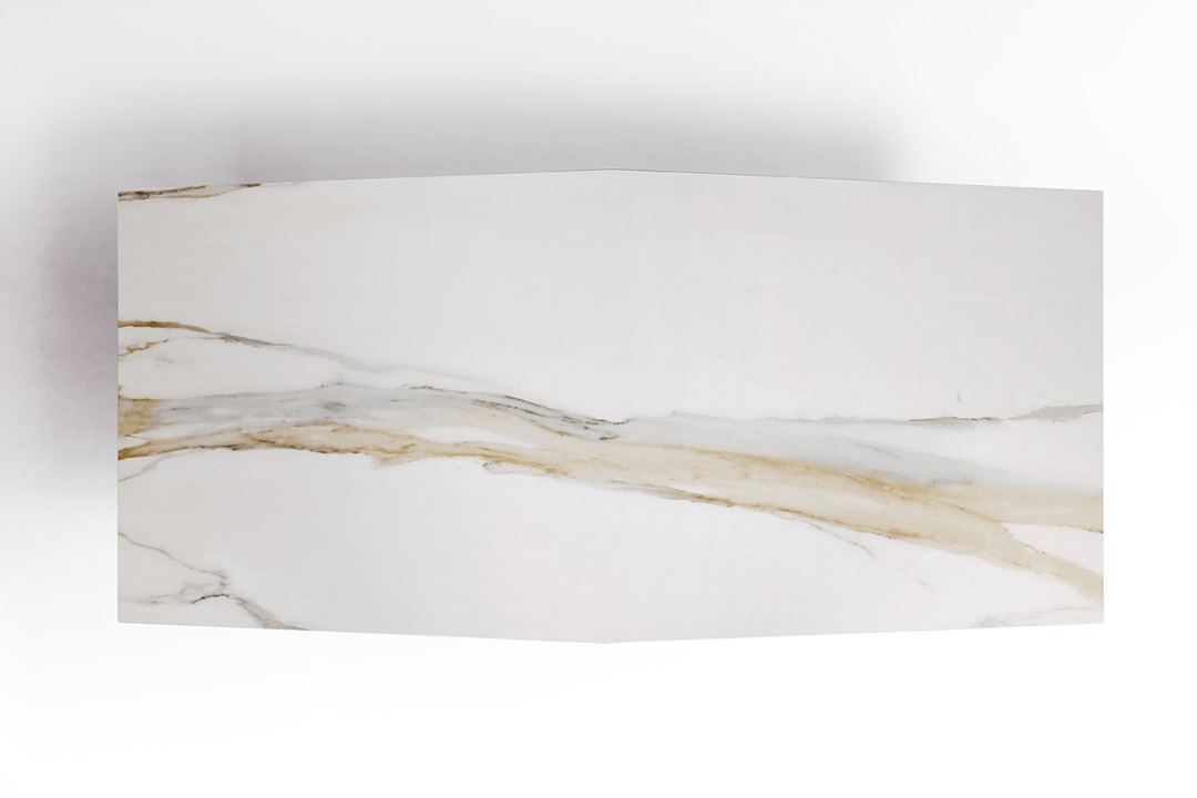 Mexa is a table with hexagonal shaped supports. The metal base is available in different finishes. Top is in ceramic, glass or wood and in