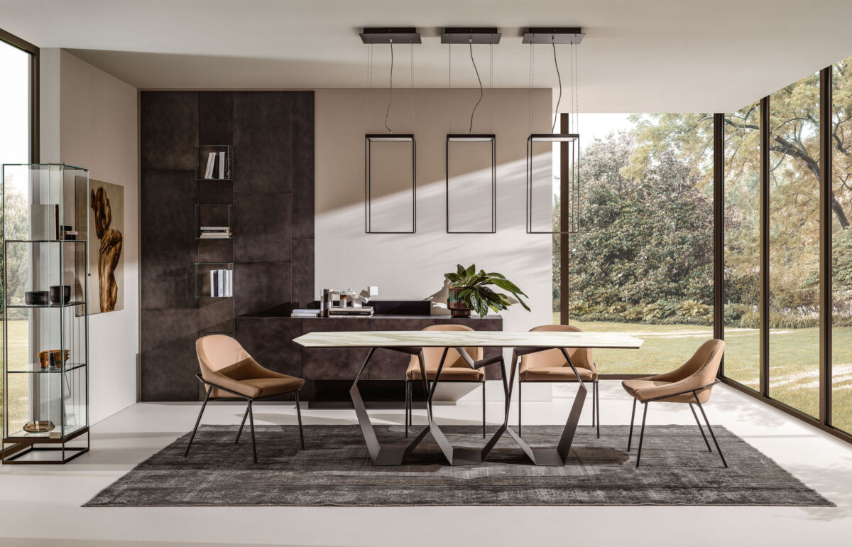 Prima is a display cabinet in extra-clear glass with side hinged door. Its internal structure is in metal with squared section. Internal