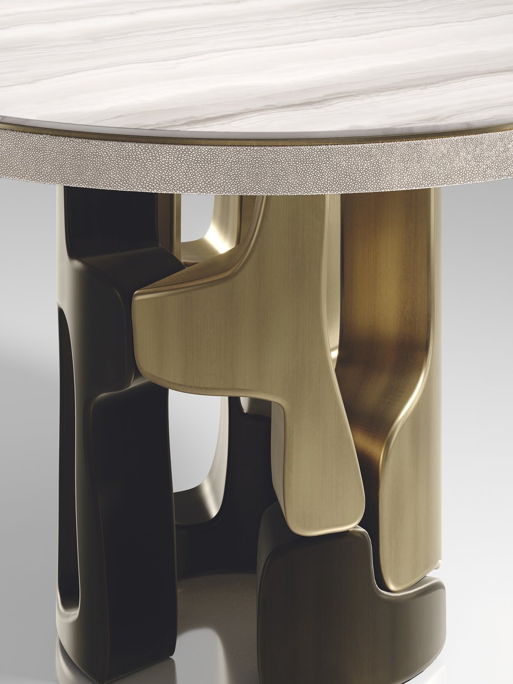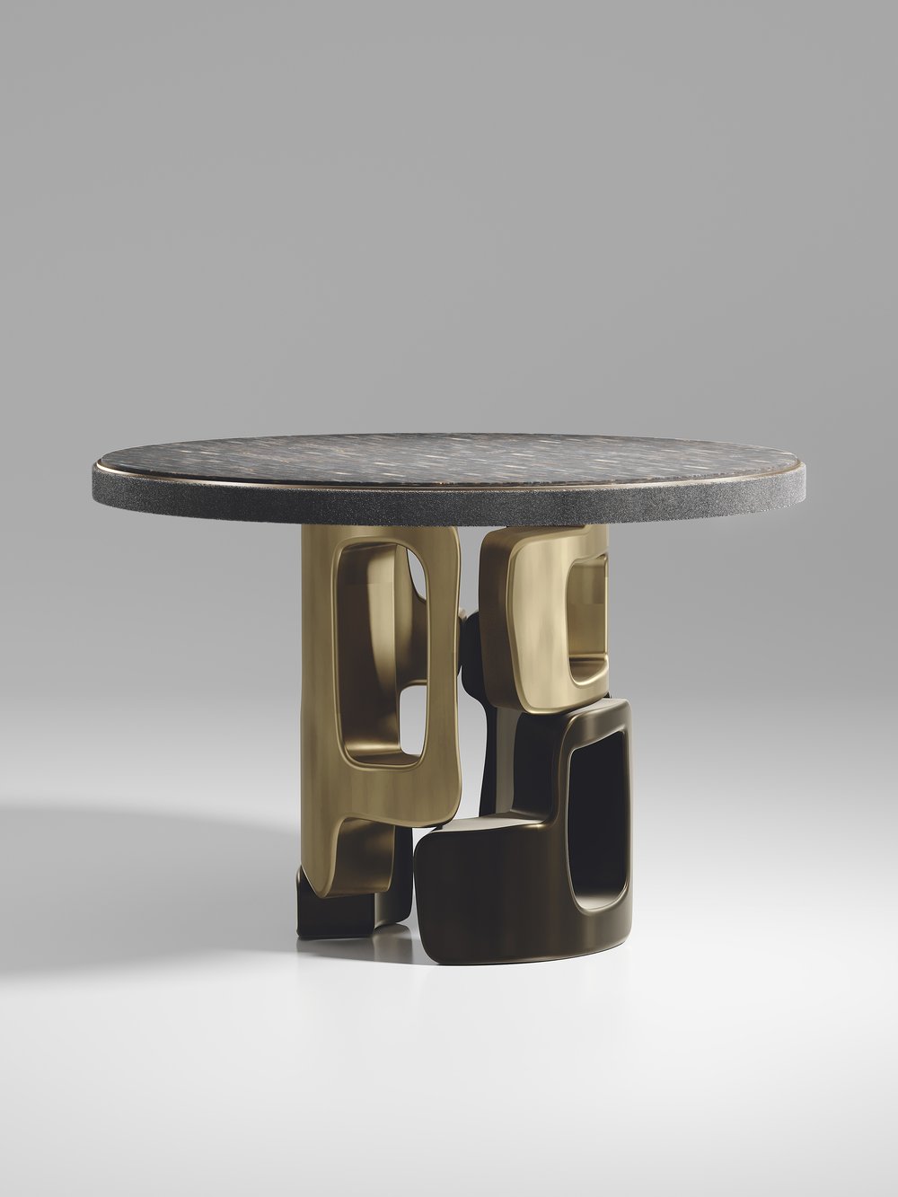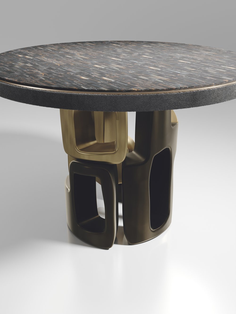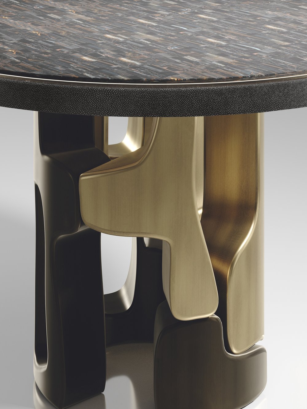 The Apoli Breakfast Table by Kifu Paris is both dramatic and organic its unique design. The tiger eye blue top sits on an ethereal geometric and sculptural bronze-patina brass base. The side band of the table is inlaid in black shagreen This piece is designed by Kifu Augousti the daughter of Ria and Yiouri Augousti. Part of the Apoli Capsule Series, see images of collection at end of slide.