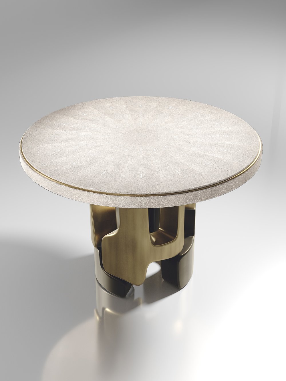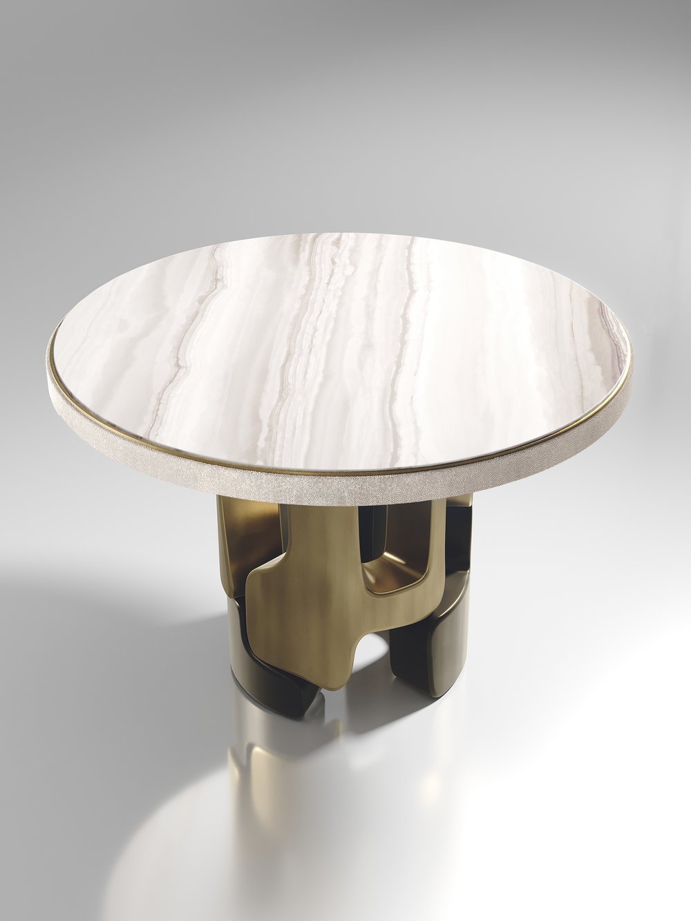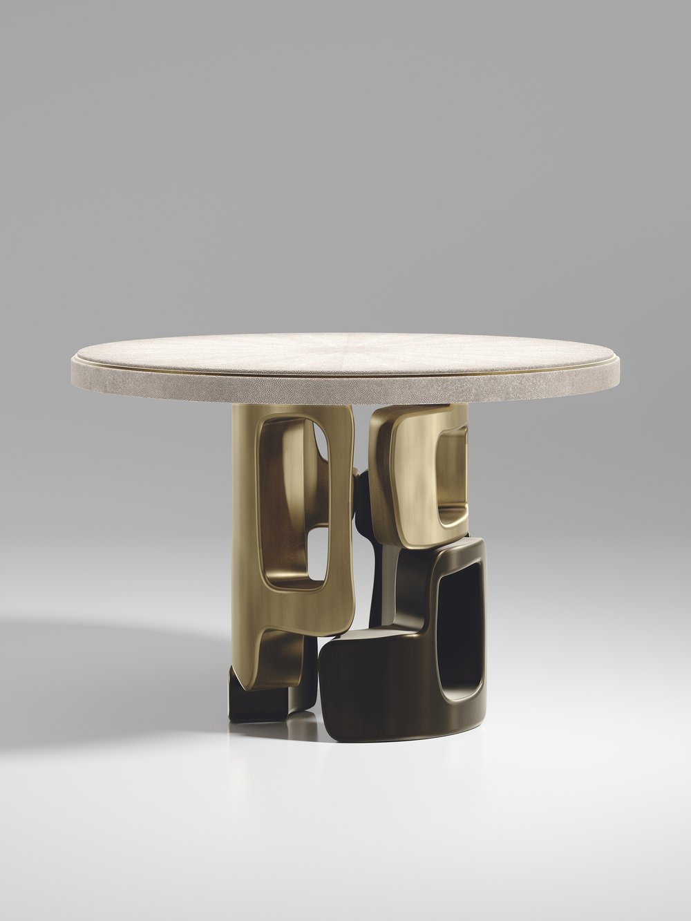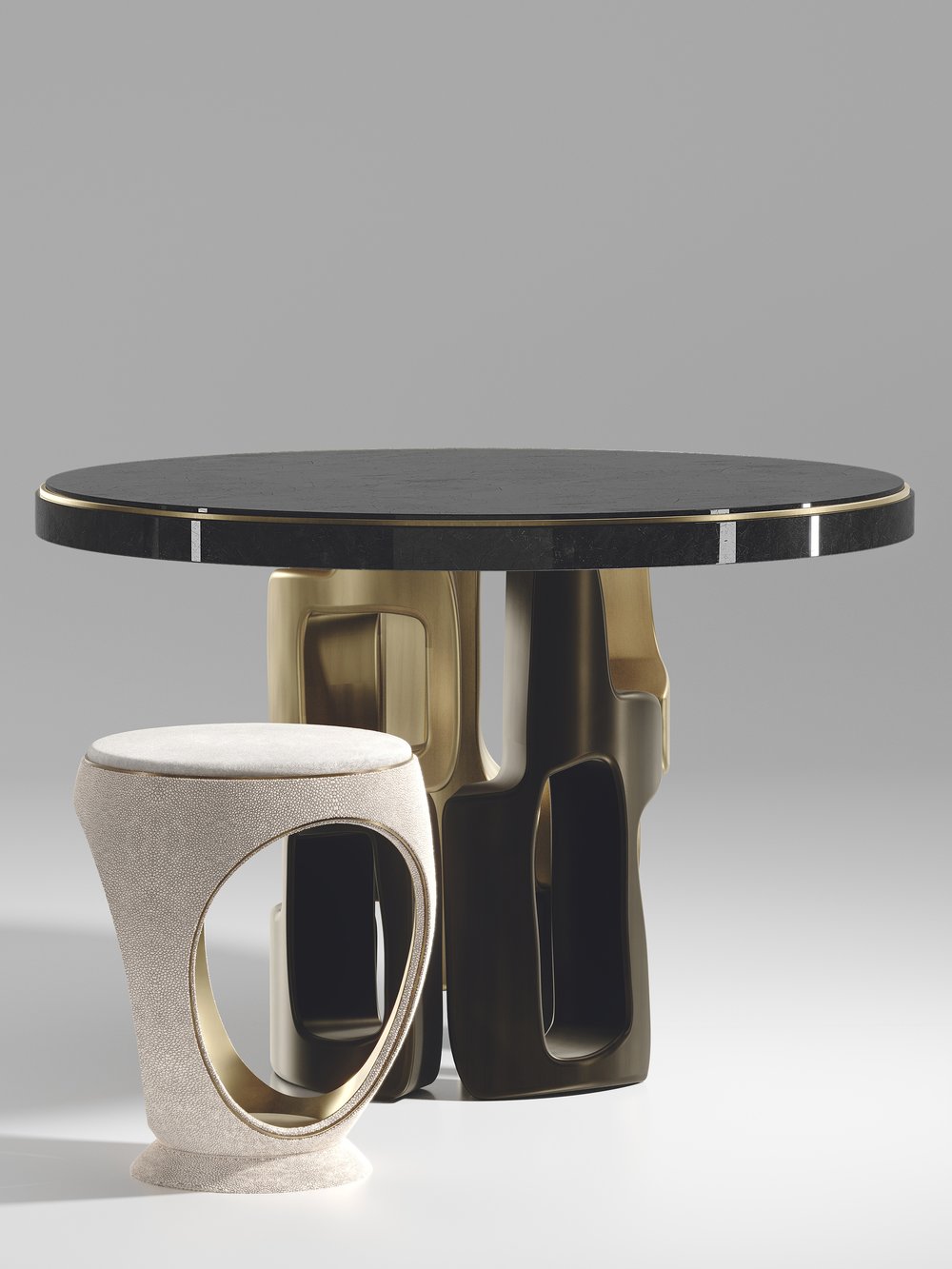 The Apoli Breakfast Table by Kifu Paris is both dramatic and organic its unique design. The tiger eye blue top sits on an ethereal geometric and sculptural bronze-patina brass base. The side band of the table is inlaid in black shagreen This piece is designed by Kifu Augousti the daughter of Ria and Yiouri Augousti. Part of the Apoli Capsule Series, see images of collection at end of slide.