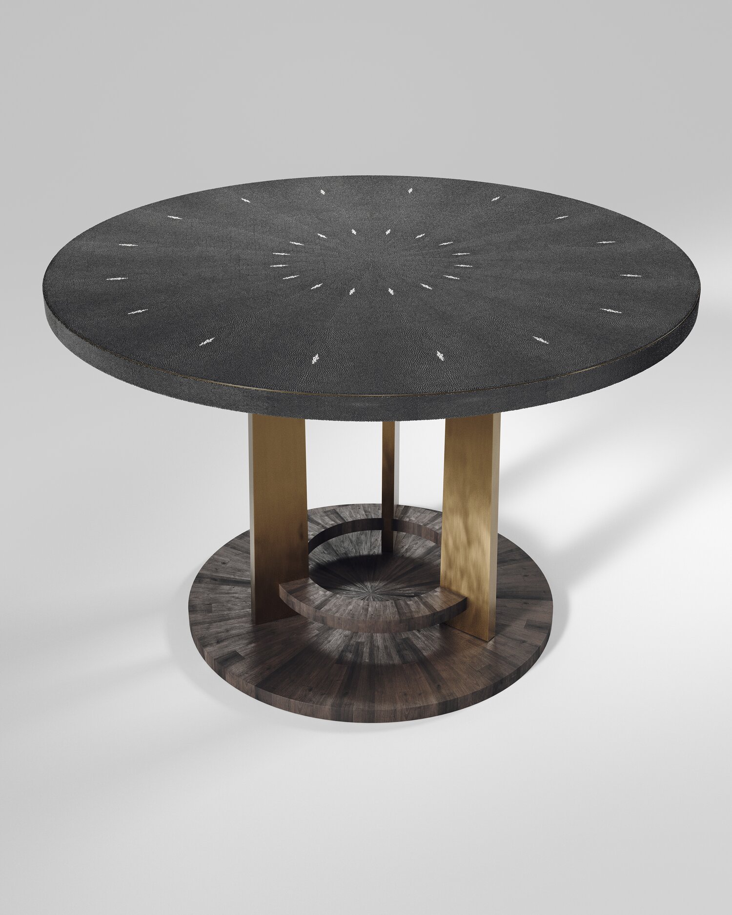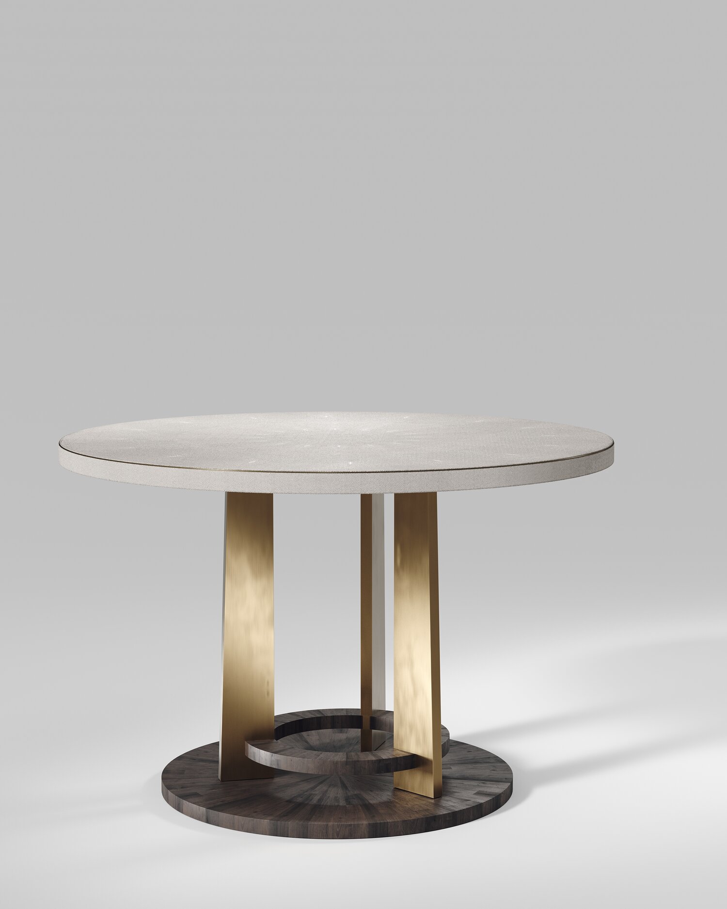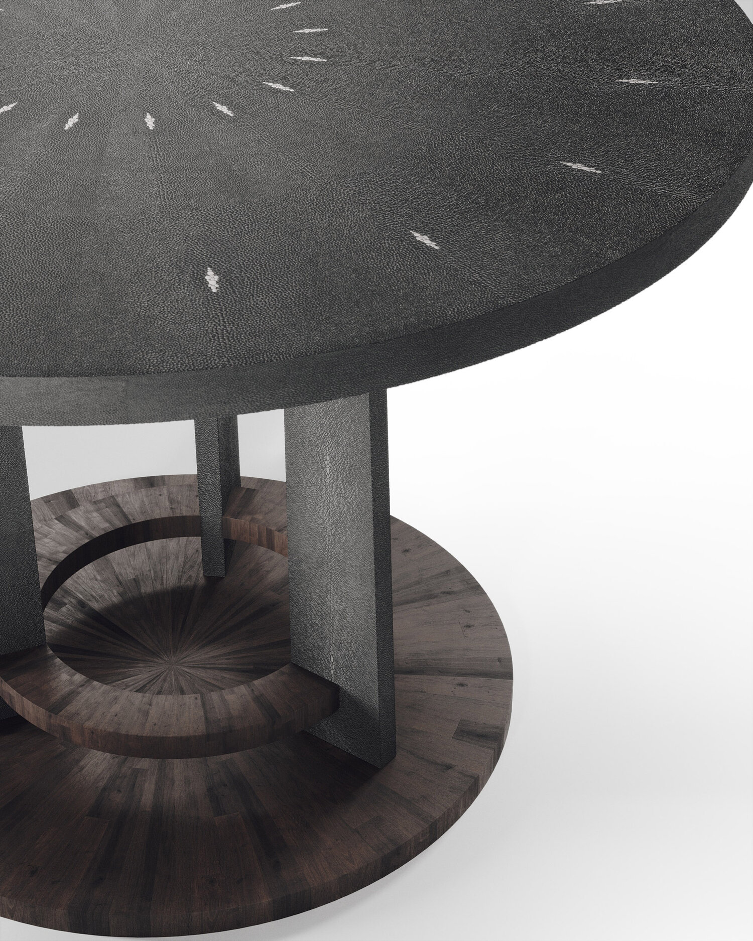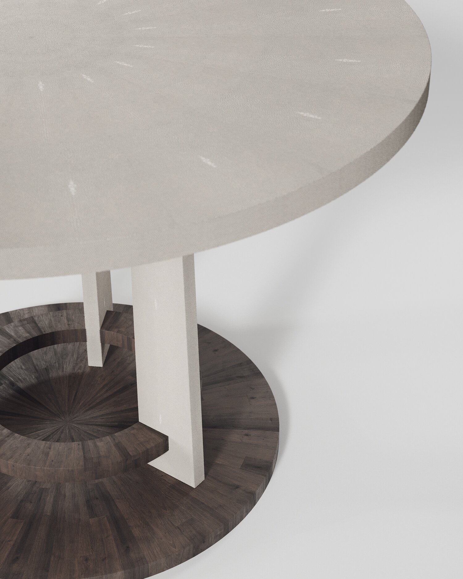 The Prague Breakfast table by R&Y Augousti is an iconic design of their collection, debuting from the 1990s. This classic centre piece can be adapted for an entrance room or custom-sized for a dining room. The circular shaped cream shagreen inlaid top sits on a cluster of geometric inlaid shagreen legs that clasp into a floating palmwood inlaid ring and separate base.