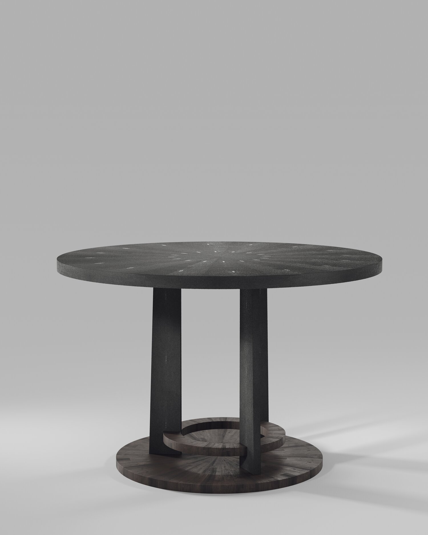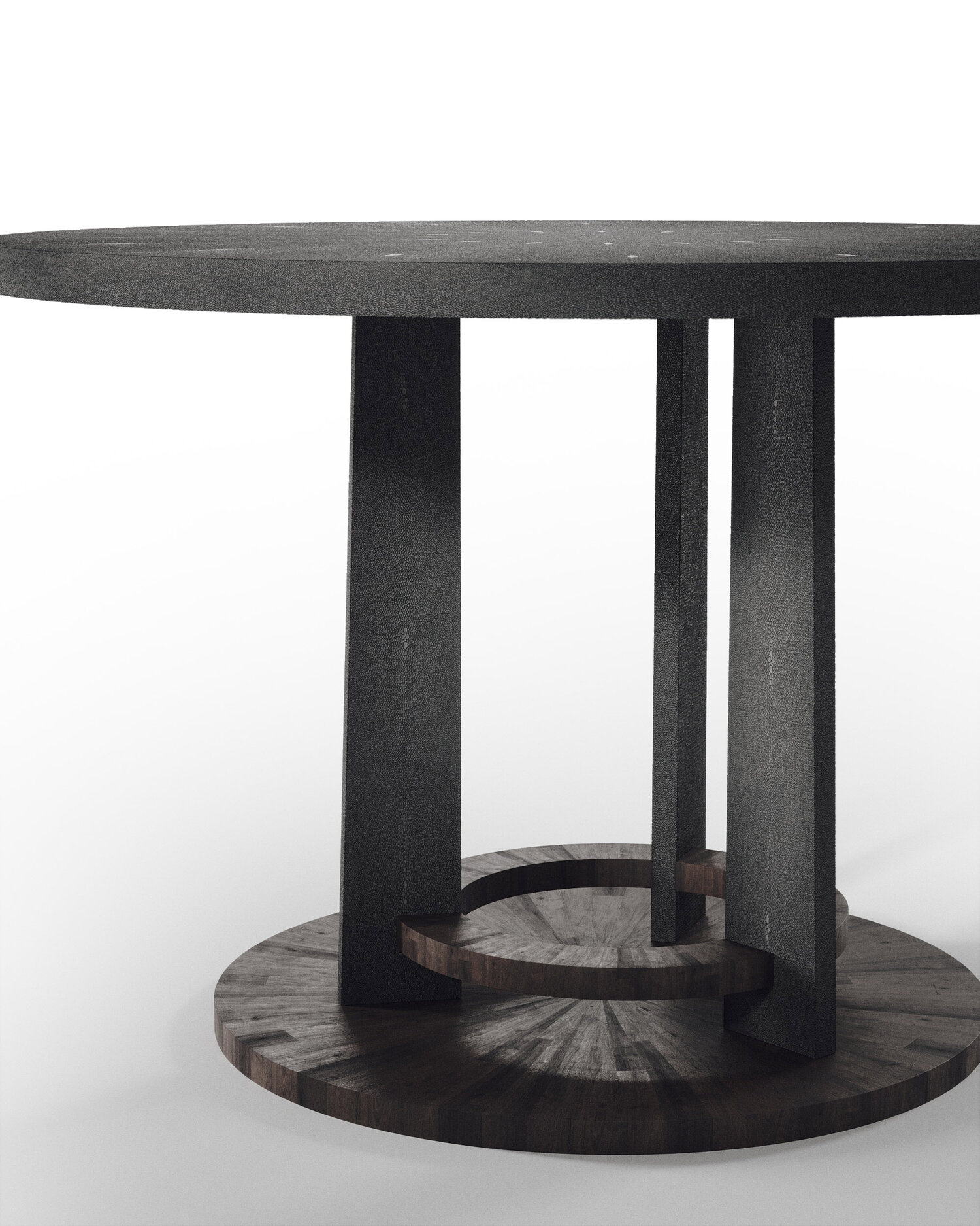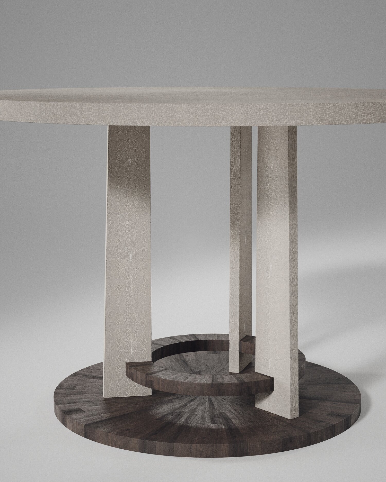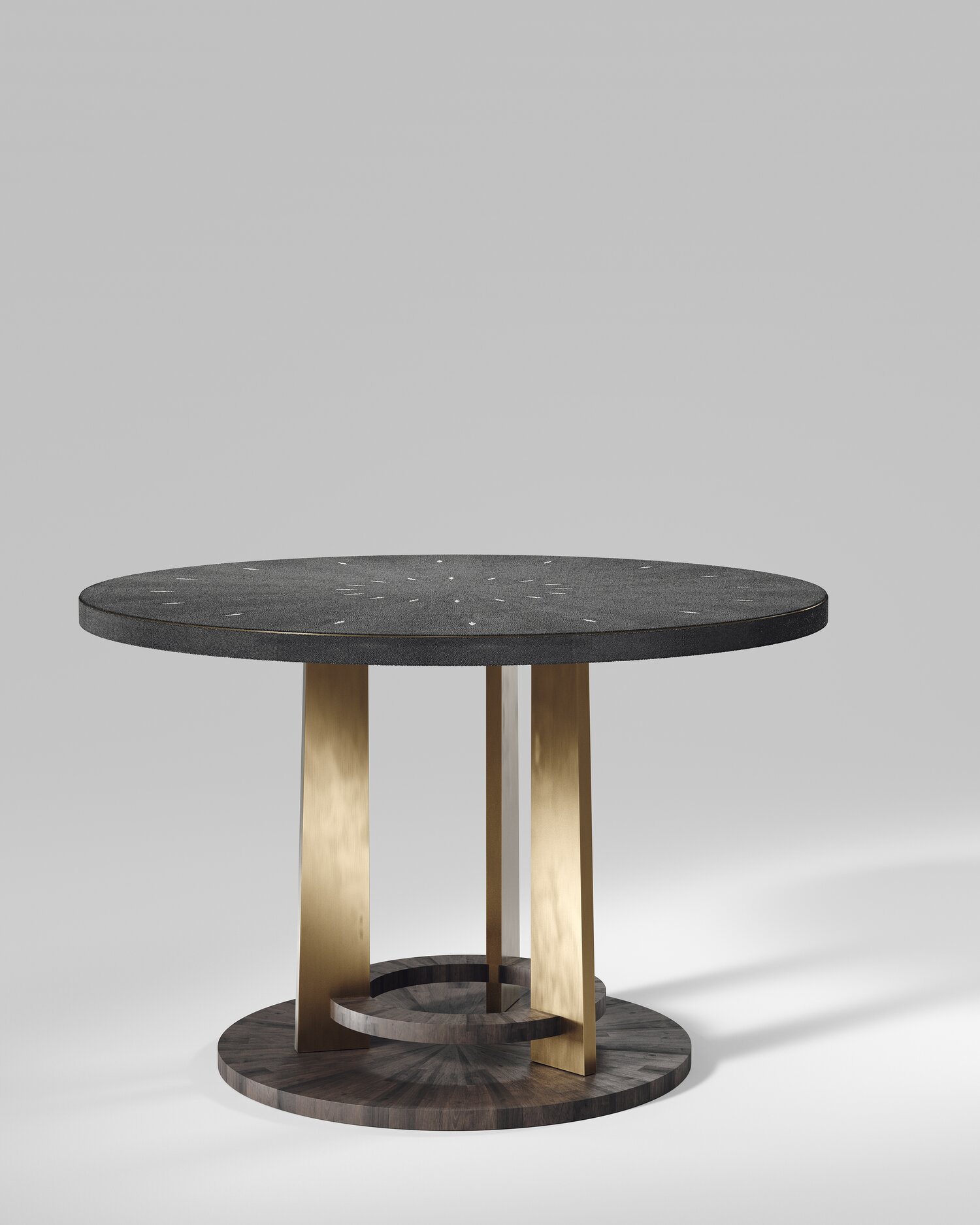 The Prague Breakfast table by R&Y Augousti is an iconic design of their collection, debuting from the 1990s. This classic centre piece can be adapted for an entrance room or custom-sized for a dining room. The circular shaped cream shagreen inlaid top sits on a cluster of geometric inlaid shagreen legs that clasp into a floating palmwood inlaid ring and separate base.