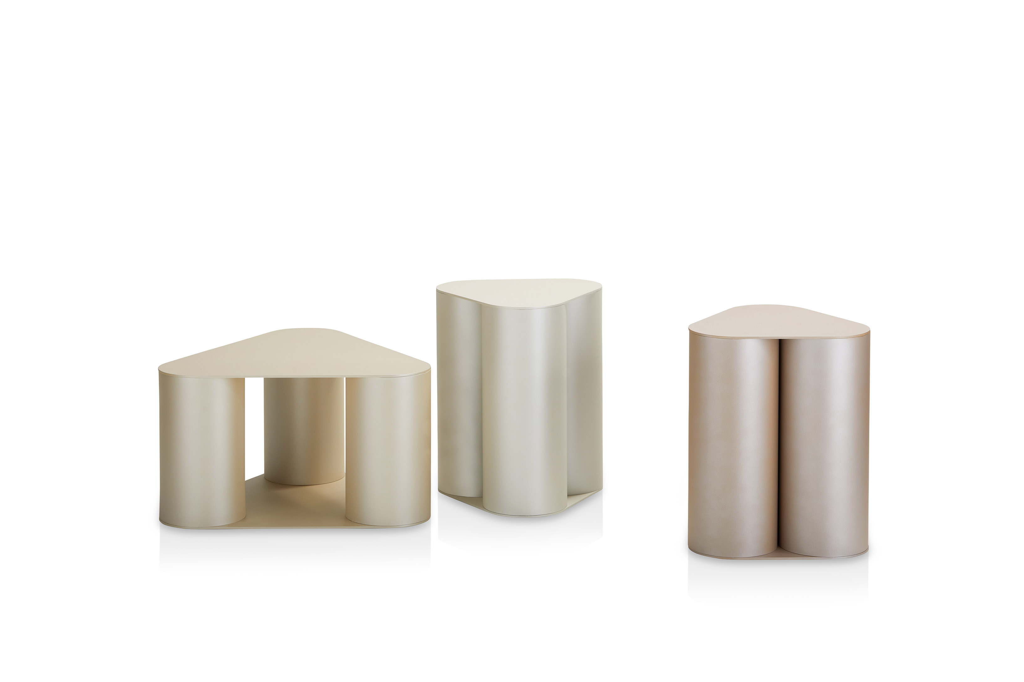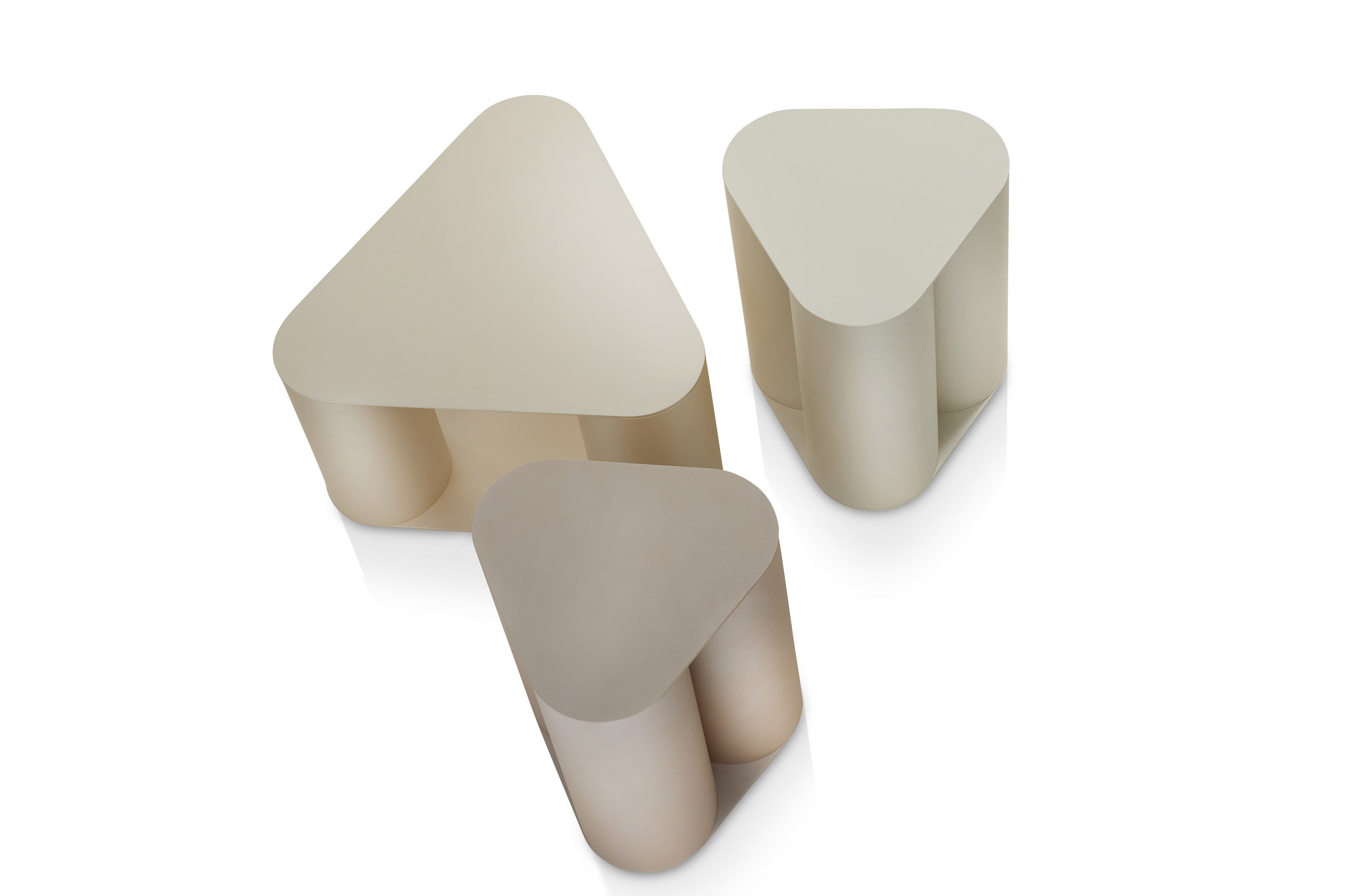 The collection is characterized by two triangular surfaces with rounded edges, distanced by three supporting cylinders.