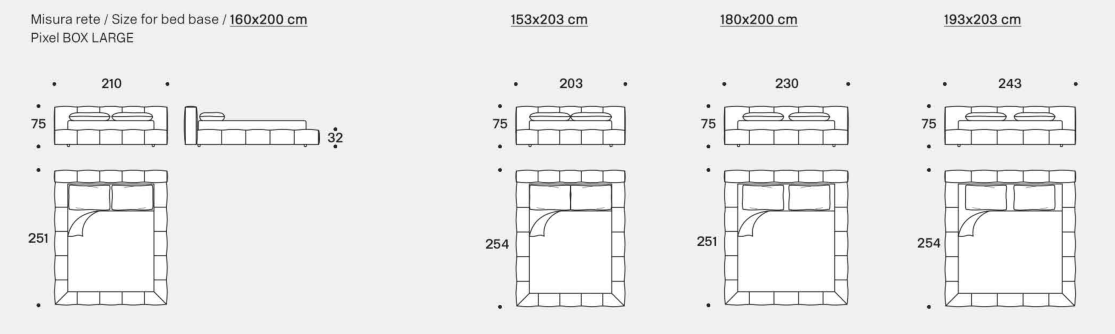 The pixel bed is soft in the entirety of its design. It offers a generous and comforting single volume thanks to the ample padding of the upholstered structure and rounded corners. The bed frame and the headboard are characterised by the quilted seams that recall Saba’s iconic Pixel sofa.
