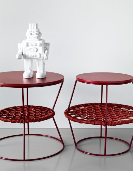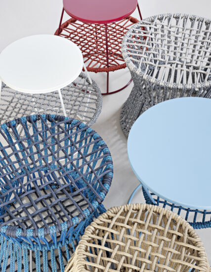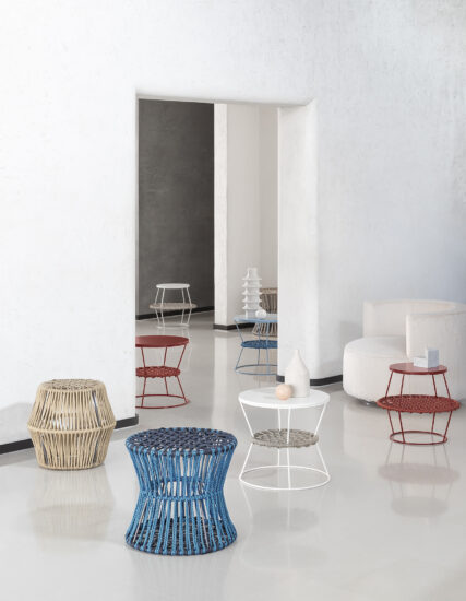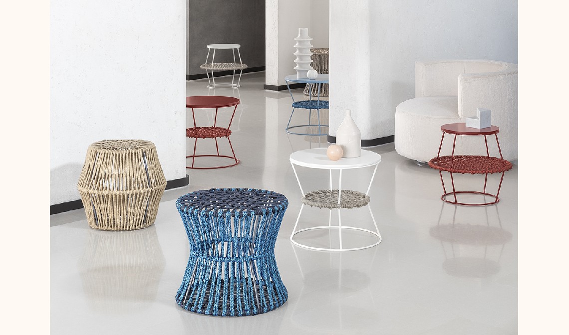 Metal, wood, rope: simple materials which reinvent commonly used objects. A collection of poufs and coffee tables made in metal rods and woven nautical cords, mixed together like the paints on an artist’s palette. The reference to David Bowie’s iconic Ziggy Stardust is no accident and relates to the irony in the idea of revolutionising the type of accessory furniture in the area for relaxing. The barrel and hourglass silhouettes come together to make up islands which expand: interweaving and volumes are enhanced in the coordination of the mixed colours of the cord, pointing to a new idea of furnishing accessory with endless possibilities of personalising the space. The two-tone plaited rope is an exclusive Saba combination.