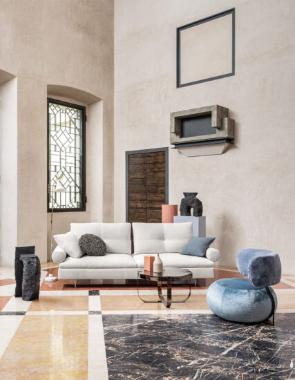 Limes New is a sofa that upholds Saba’s philosophical approach to a larger furnishing project: “Everything slides, everything changes” elaborates Parmenide, who ignited the creative process and guided it through the research phases from the early 2000’s. Limes New is an invitation to go beyond the conventions of predefined space, showcasing how it can become something else altogether simply by moving the back rests. Limes New is a story to tell renewed through sartorial and technical detailing: the asymmetric cut of the back cushions improves support in the lower back. Research into new materials allows the sensation of softness from the goose down filling to come through and guarantees a superior comfort. The volumes have been subtly updated in line with the contemporary aesthetic to include cylindrical armrests in homage to the classic latin heritage. Methacrylate and double depth floating feet.