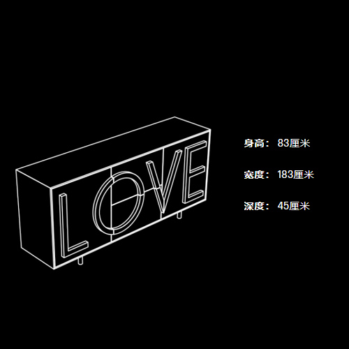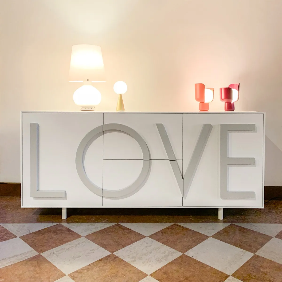 Con la sua forma caratterizzante e tutta da scoprire, la madia LOVE (cabinet) costituisce un manifesto espressivo, un poster bidimensionale che parla d’amore. Dal connubio tra estetica e funzione, le linee diventano tridimensionali, il foglio si estrude diventando contenitore e le lettere escono dal foglio generando delle maniglie, elementi versatili e disponibili in vari colori. ?Amore è scegliersi a scatola chiusa, avvolti da un alone di mistero. Amore è un fedele custode di sogni condivisi, un contenitore di possibilità? Fabio Novembre