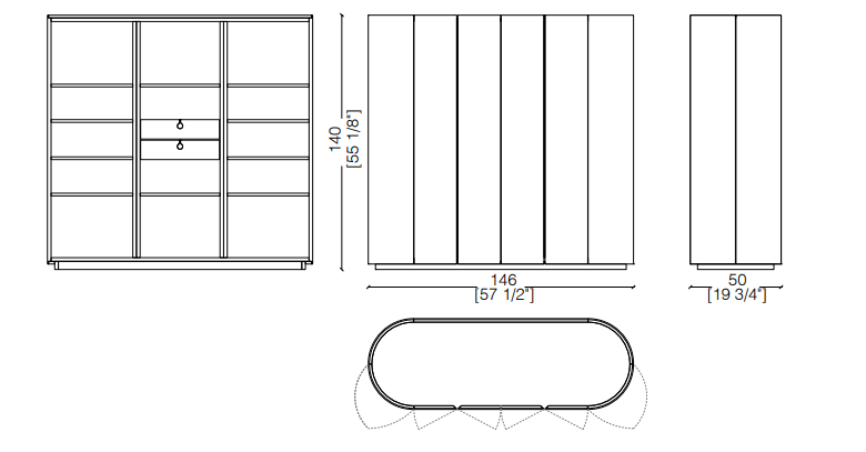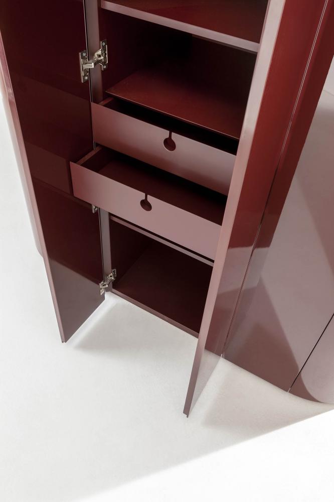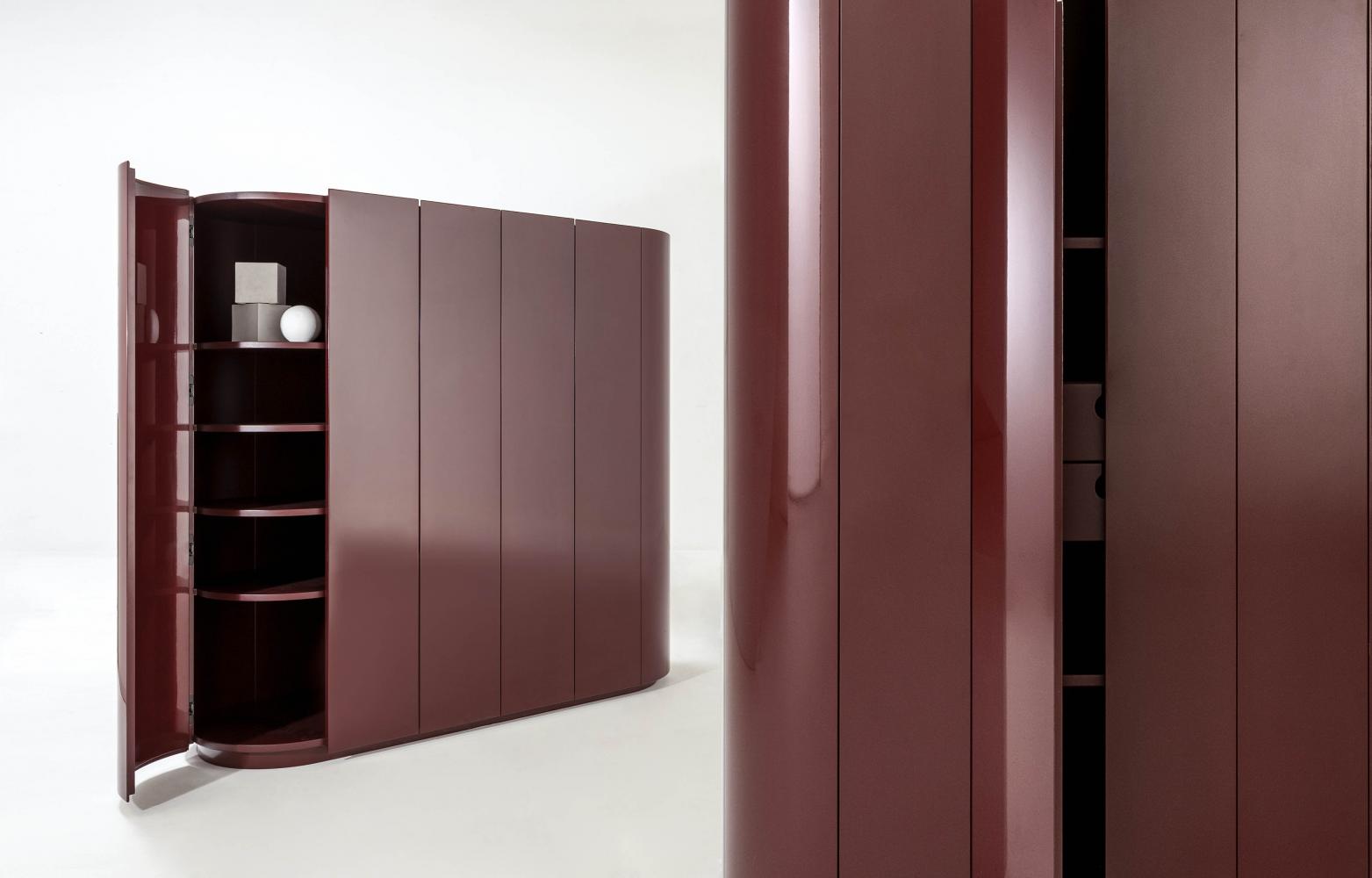 Storage unit in plain, dyed or lacquered wood with 6 hinged doors and curved sides. Equipped with internal shelves and drawers.