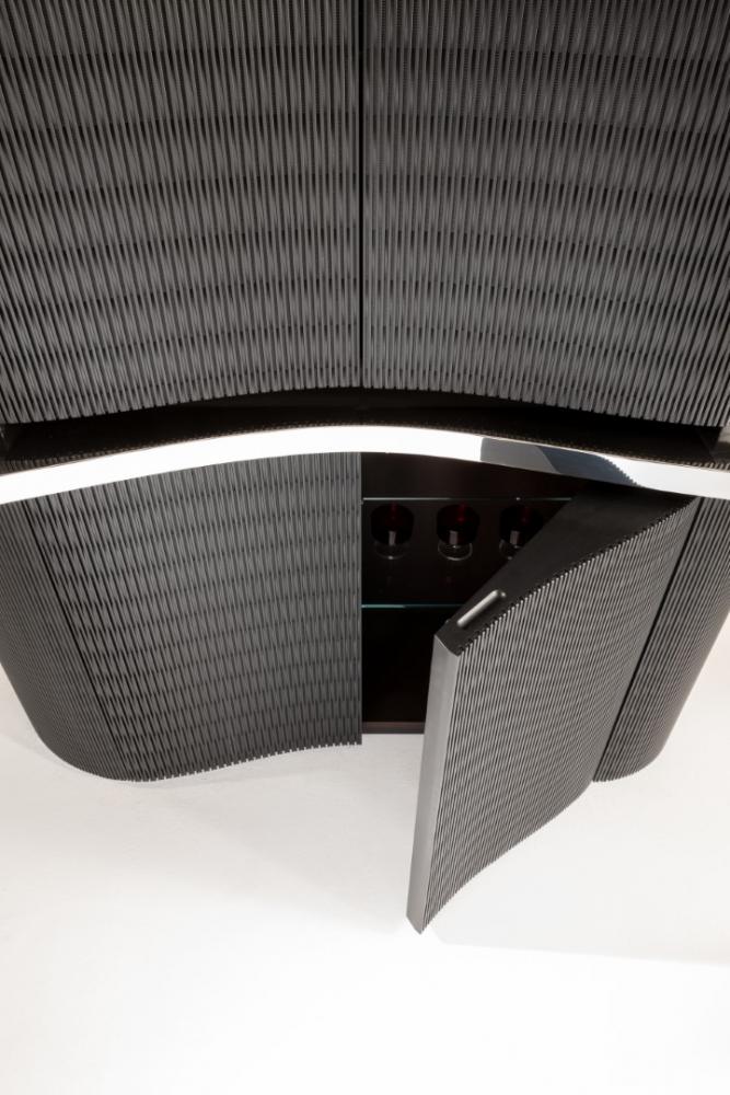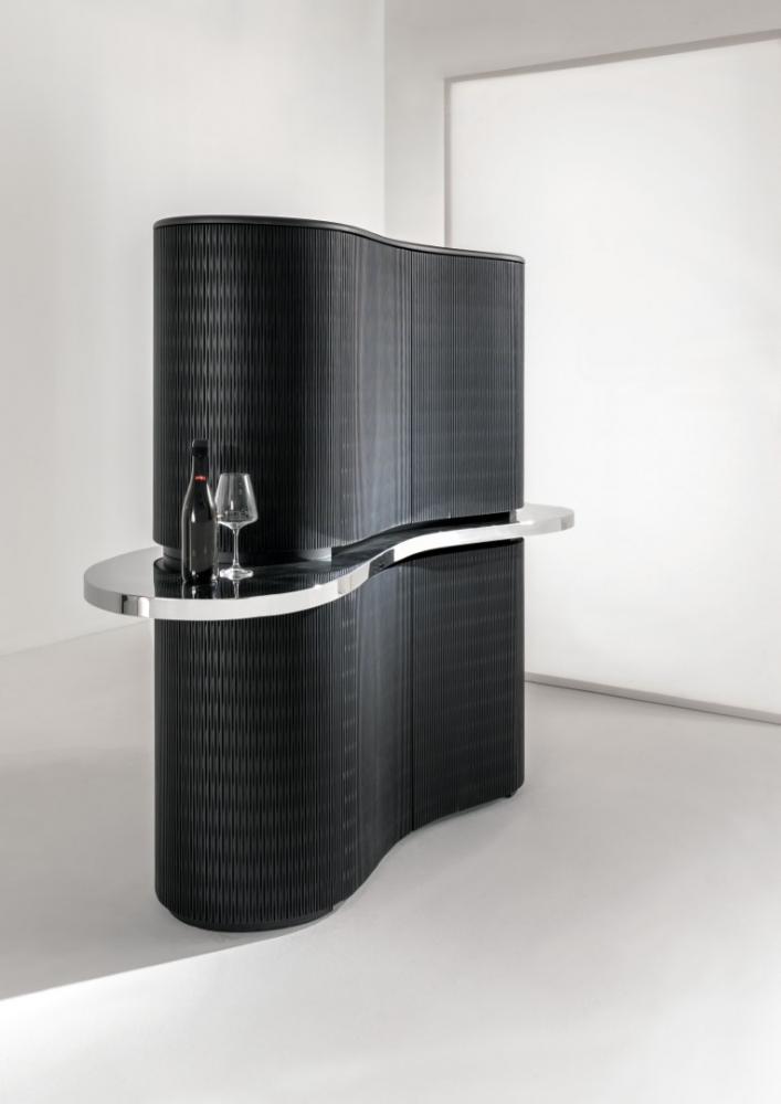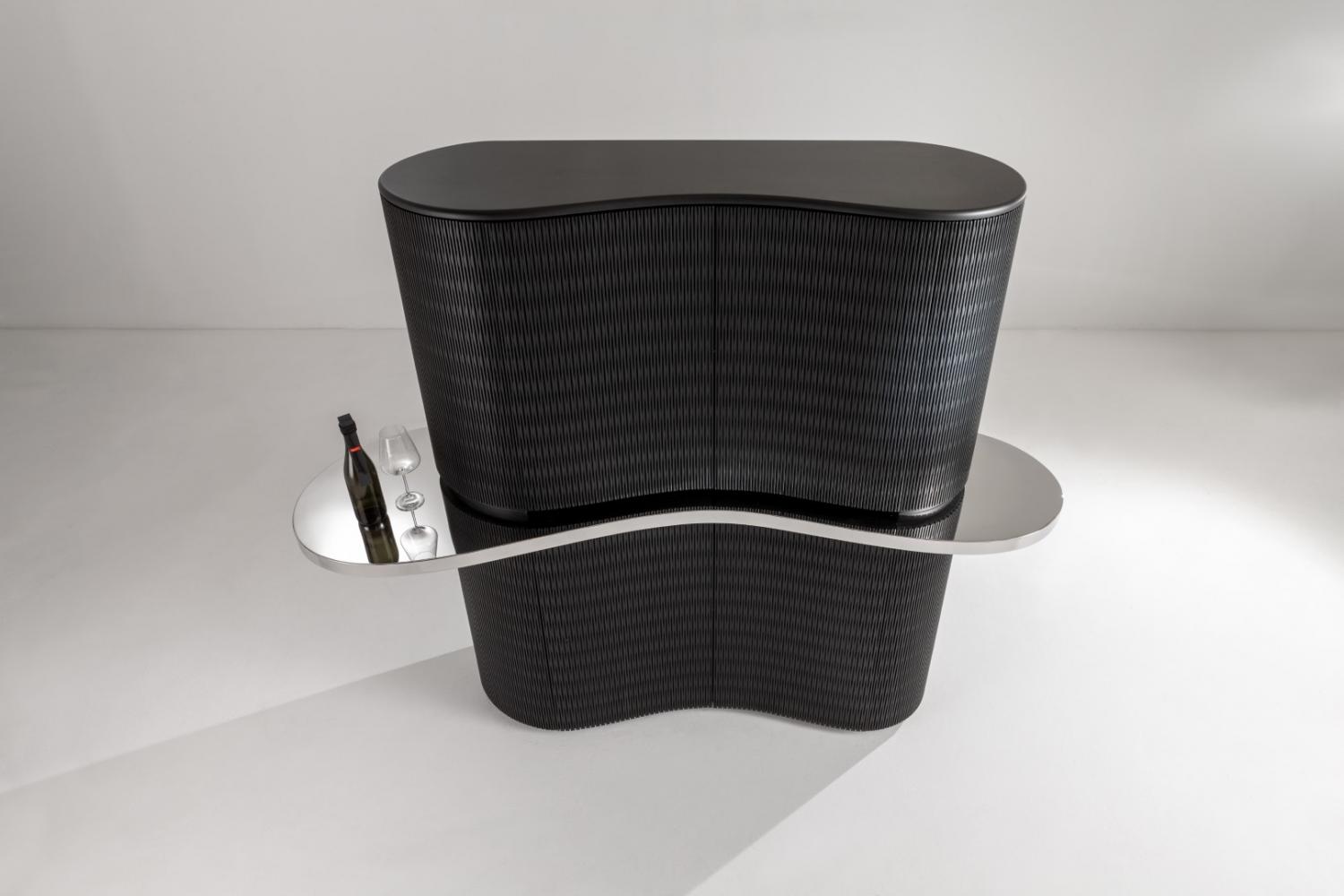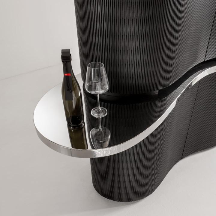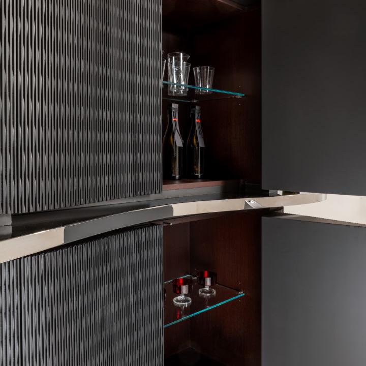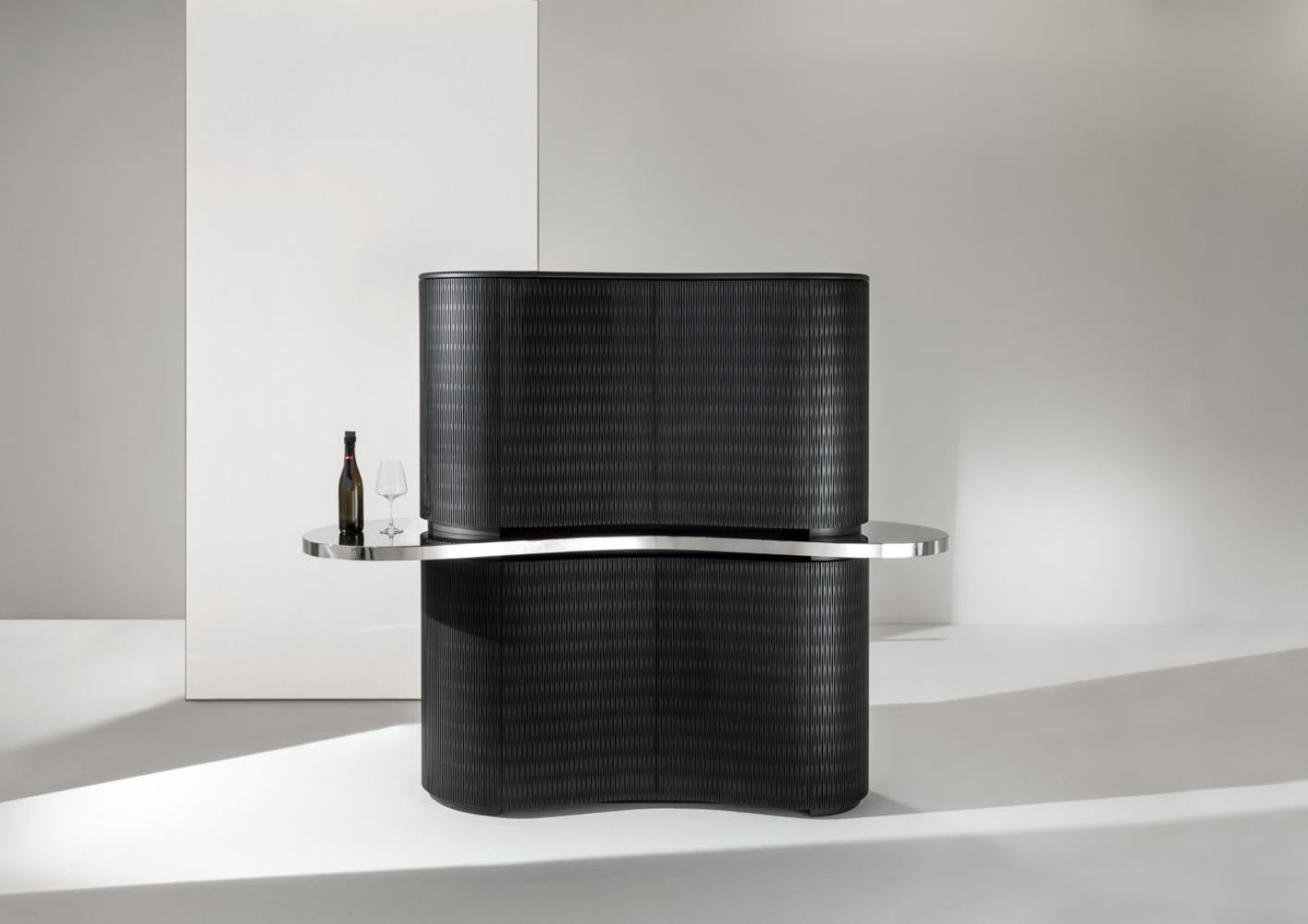 Tall sideboard in Lacca 61 wood, characterized by a curved shape and equipped with four hinged doors. Surface decorated with the iconic Infinity honeycomb geometric design and integrated top in polished steel.