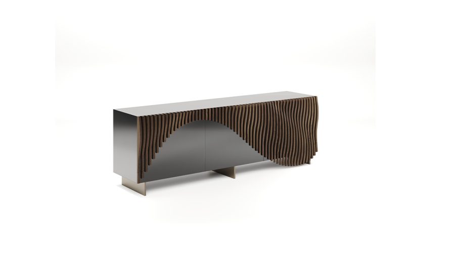 Buffet con struttura rivestita in specchio Fumè e listelli decorativi in legno. Piedini in 100M bronze.