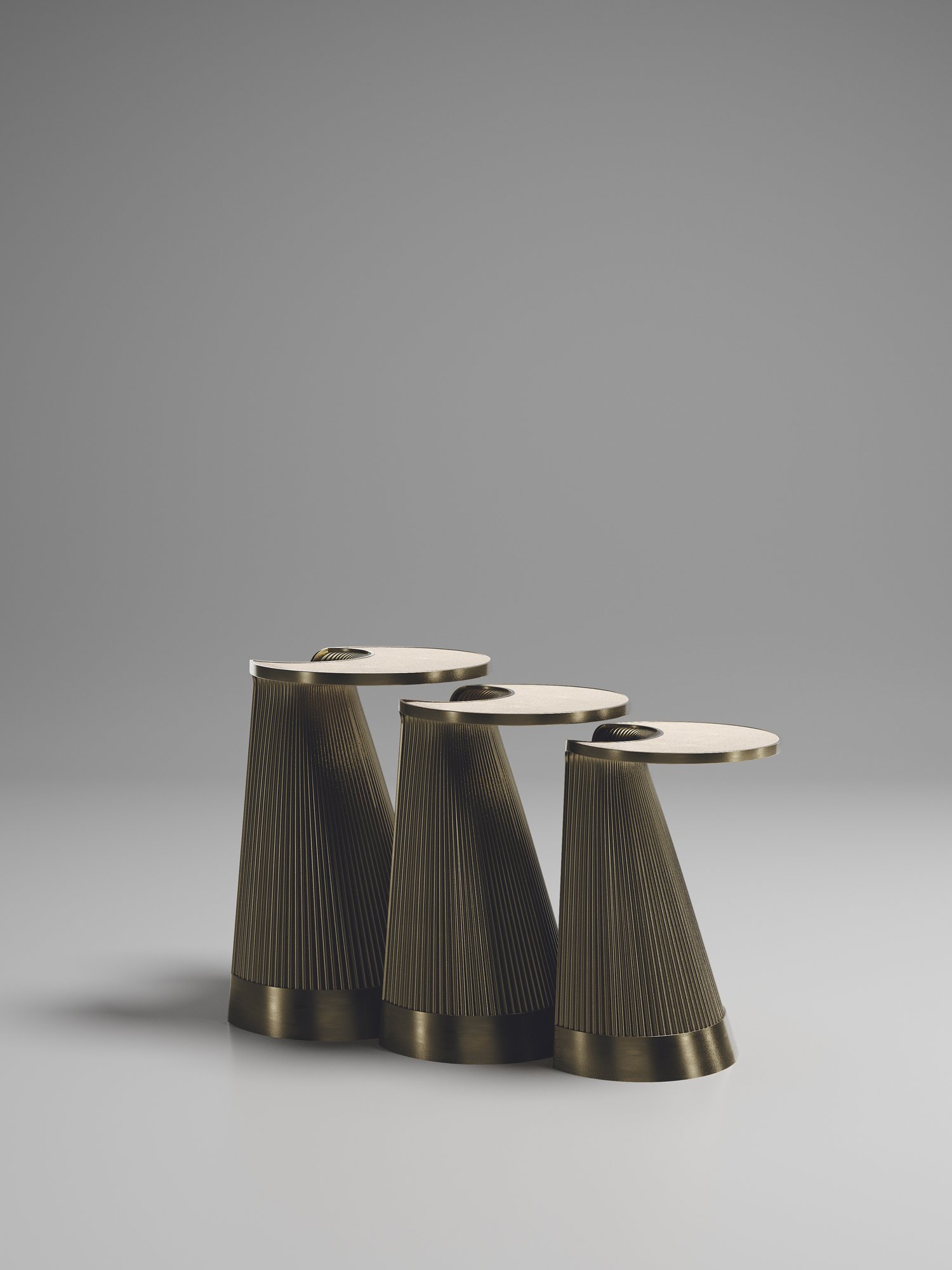 The Nymphea set of 3 nesting side tables by R & Y Augousti explore the brand's iconic DNA of bringing old world artisanal craft into a contemporary and utterly luxury feel. These pieces are done in different finish variations including shagreen, pen shell with bronze-patina brass accents. This listing is for the set of 3 nesting tables, the pieces are available to purchase individually on request. Custom sizing/finishing on request.